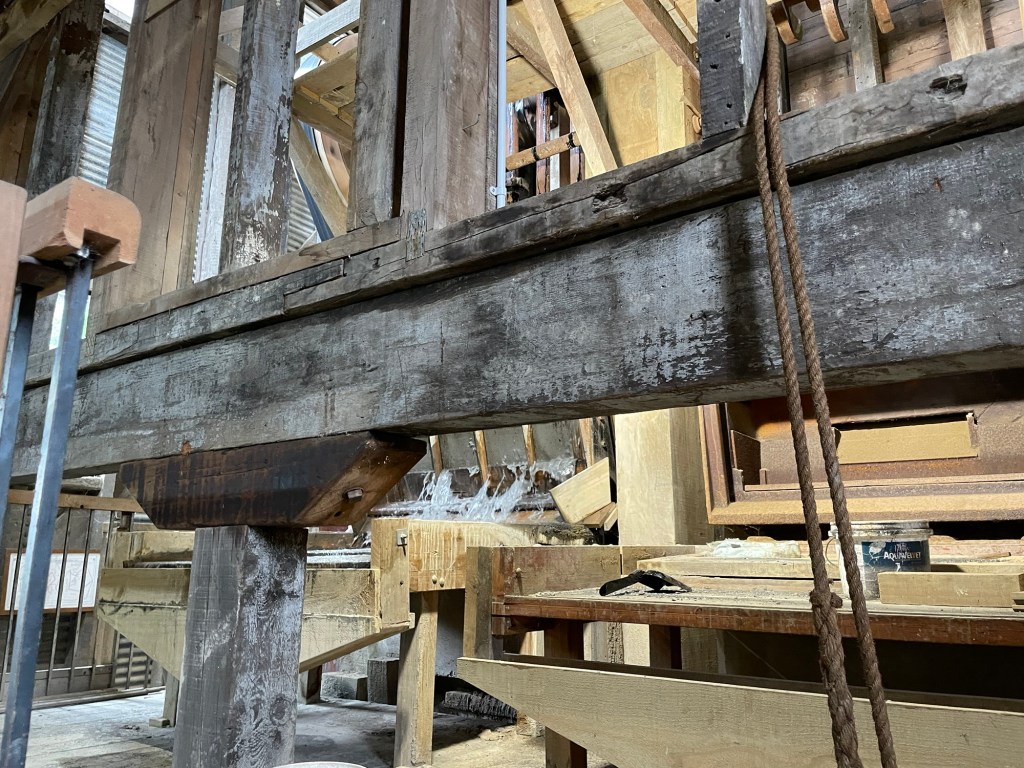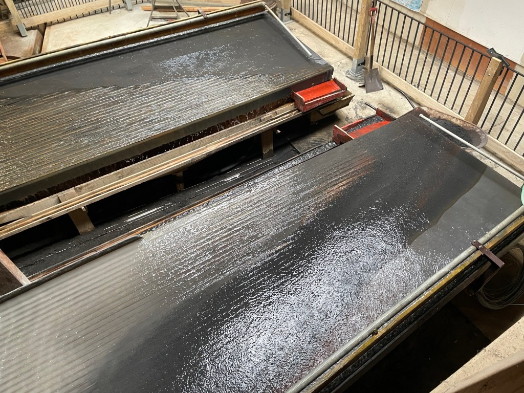 Emerging from the mine, we proceeded into the battery building. Four stories tall, it contained the machinery that liberated gold and other precious metals from the surrounding stone. Our guide took us through and explained how everything worked. Then to our great surprise he triggered a control that set the whole thing in motion! The mill and all its machinery is still operational, and we got to see the triphammers pounding stone into powder, water rushing through sluices carrying sand and grit, and the shake tables separating valuable metal from worthless tailings. (Actually not all that worthless; the process we witnessed leaves up to 40% of the precious metal in the tailings pile. Methods developed later on capture far more, but rely on zinc and cyanide to do the work.) In any case, there was no gold to see today; the battery was processing plain old road gravel for this demonstration.