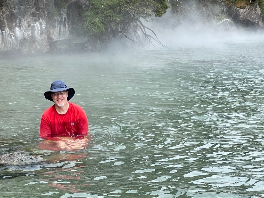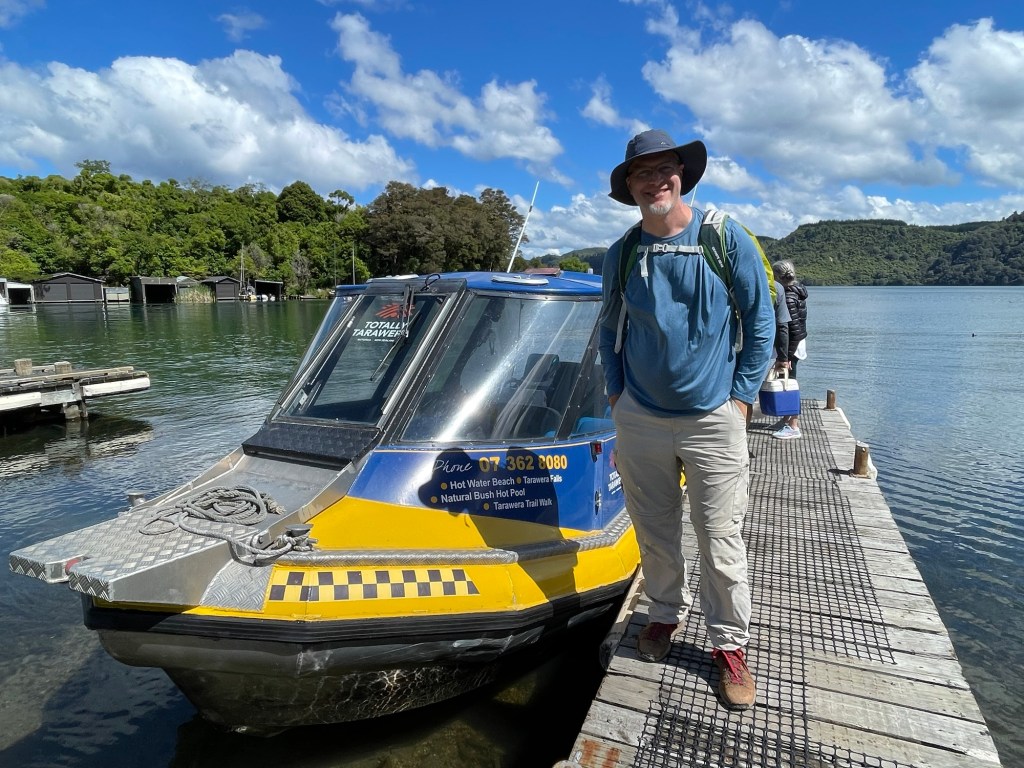 We arrived at the hot beach ready soak away any sore muscles. We had the place mostly to ourselves – only one other couple was there before us and one other arrived after. We all agreed that the experience was different from what we had imagined. The hot springs mix dynamically with the colder lake water so that you can feel hot and cold on different parts at the same time – and as the waves and eddy currents move around you, the mixture changes over time. We were cautious about swimming because the water in some areas is scalding hot, so we mostly waded in the shallows. With a little bit of work, Nick found a spot that was well heated and fairly consistent. Susannah discovered that the sand is hotter as your feet sink in deeper, so you can maintain a good wading foot temperature by shifting position slowly from time to time. We played in the water for about 45 minutes until the water taxi arrived to whisk us back to our car.