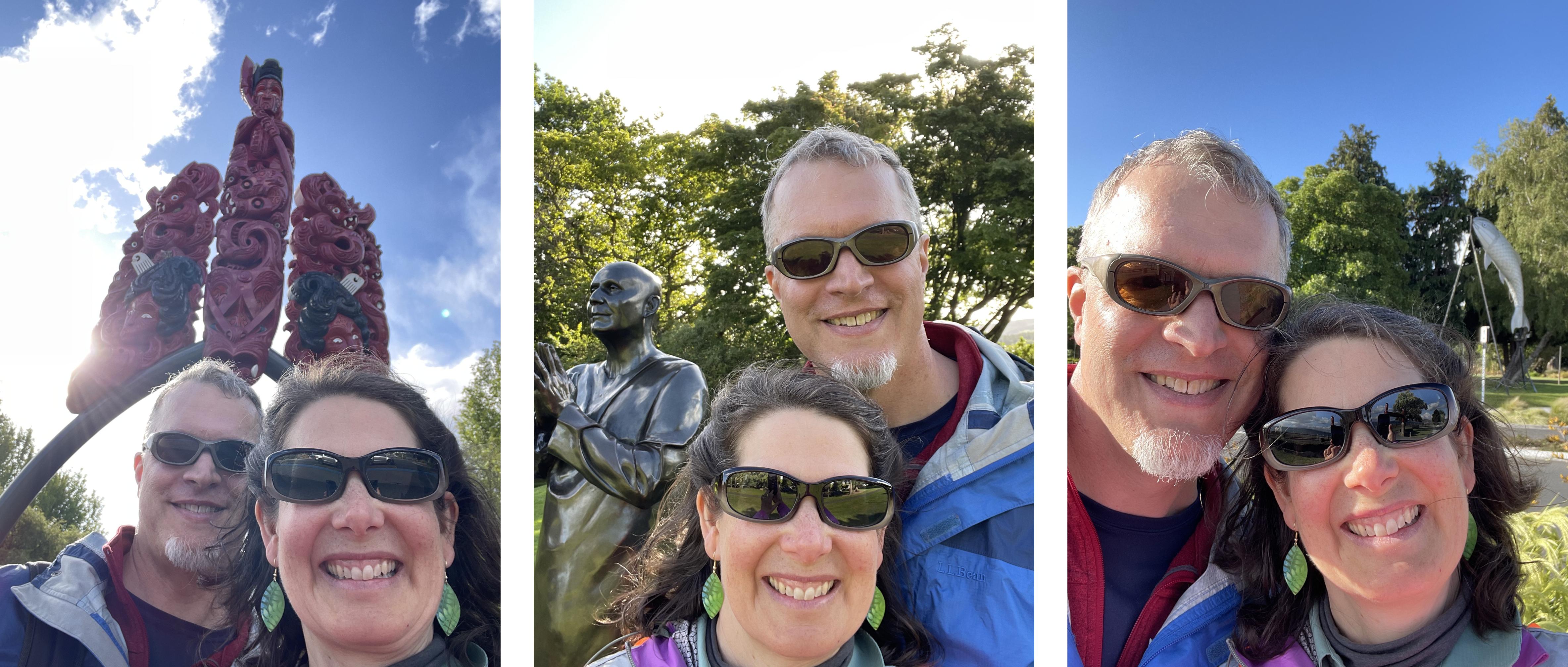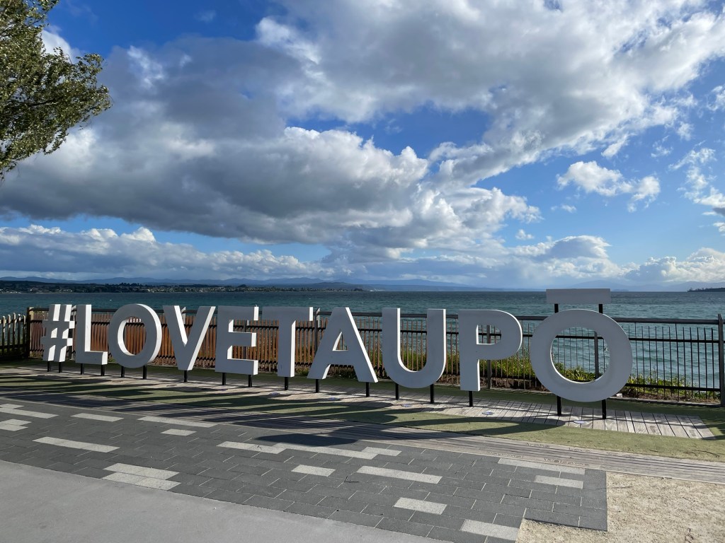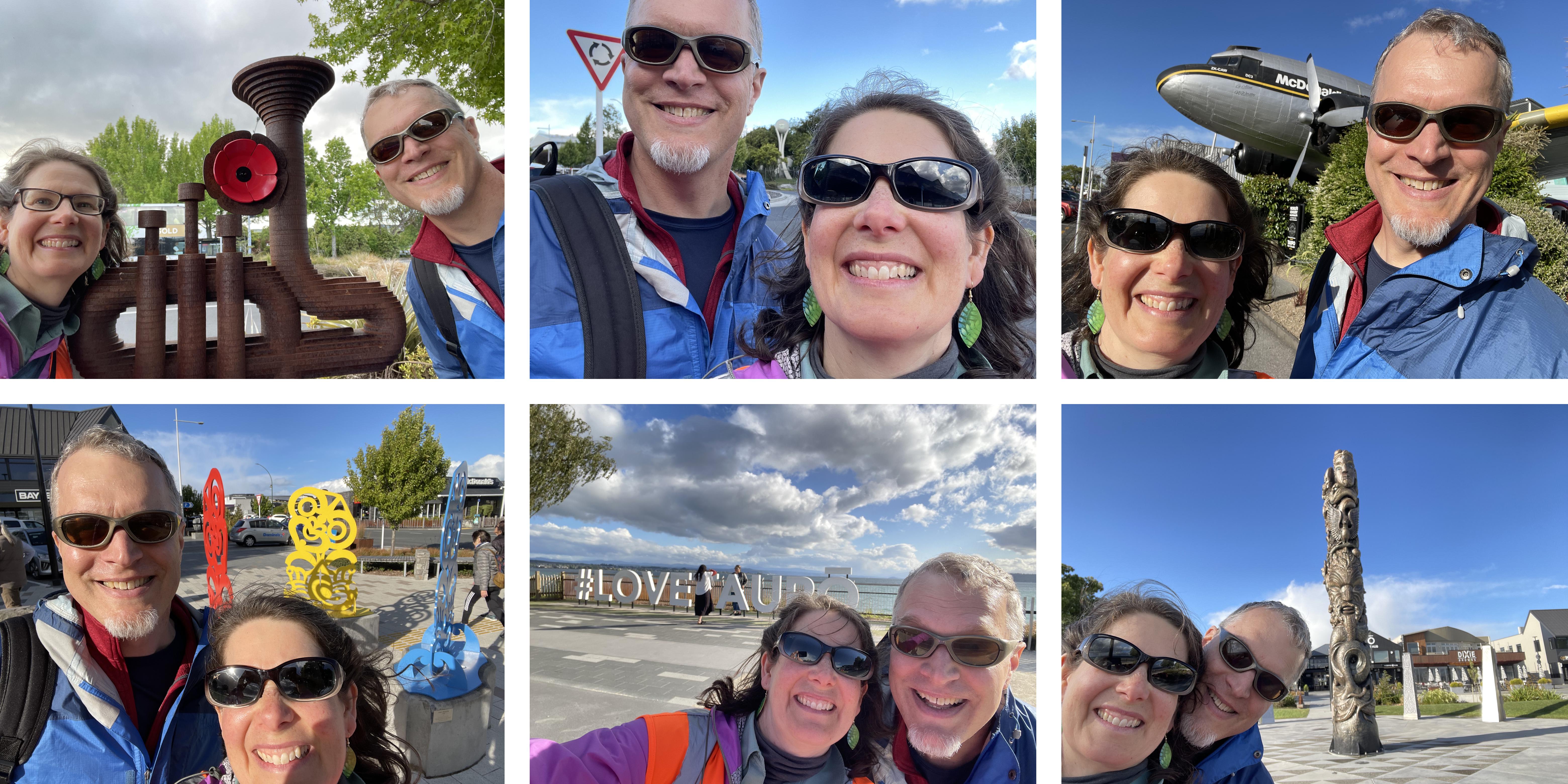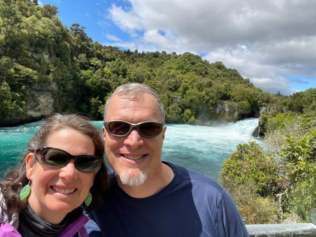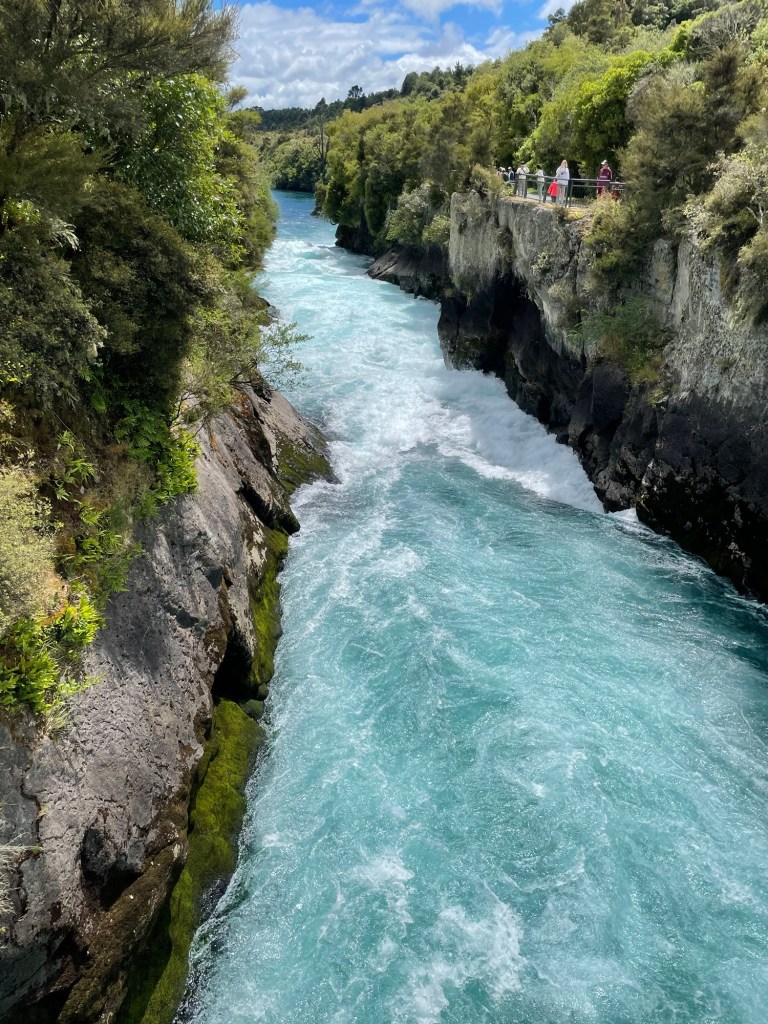 Today we pulled up stakes in Rotorua and made our way south to Taupo, on the shores of the eponymous lake. The weather was a bit iffy, with sun one moment and rain the next (or even hail at one point!) so we didn’t plan any big outdoor activities. Fortunately for us, the sun was out as we drove past Huka Falls, where the outflow from Lake Taupo flows through a natural flume before falling into the basin below. The flow is impressive, but the color is even more striking.