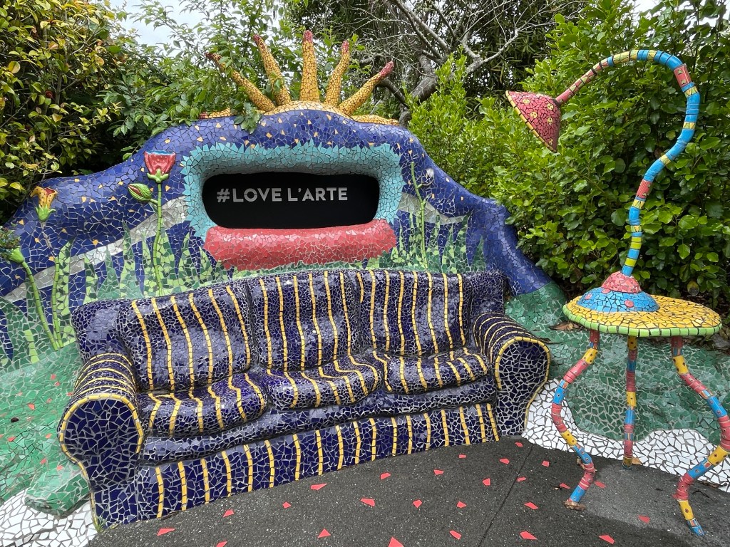 For lunch we followed a recommendation in our guidebook and sought out a cafe/art studio called L’Arte. Besides excellent food, they offered eclectic artworks such as this concrete mosaic sofa and ceramic flowers. (We declined to test the comfort of the sofa cushions, since it had just rained and they were still wet.) Even the bathrooms were done up in style!
