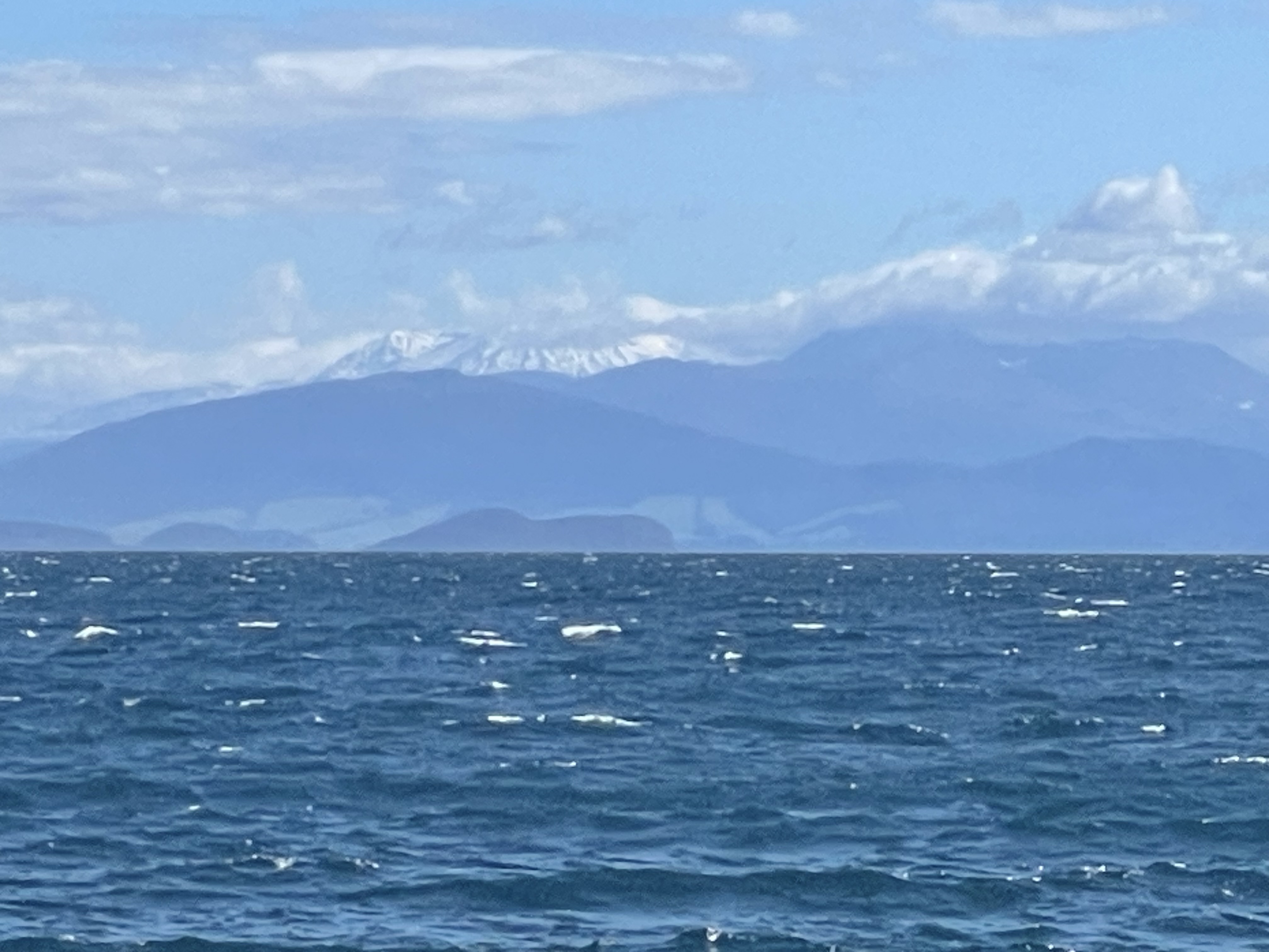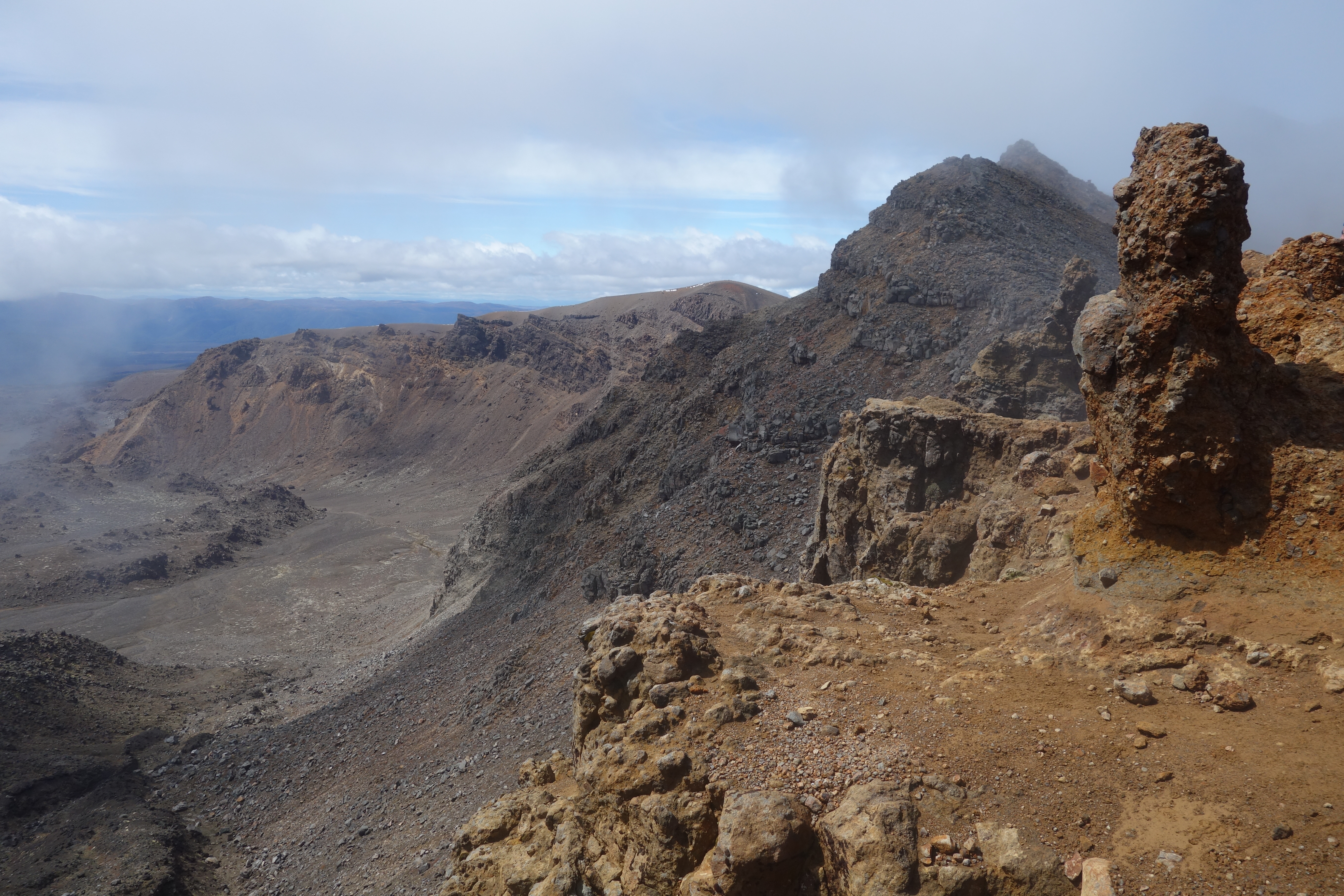 Shortly after Blue Lake we climbed over a pass and opened up a new vista to the north. That’s Lake Taupo in the distance, with the smaller Lake Rotoaira in front of it. Our kayak trip the day before was on the north (farther) shore of Lake Taupo; as it happens, that day we also took a picture of Mount Tongariro from the lake.