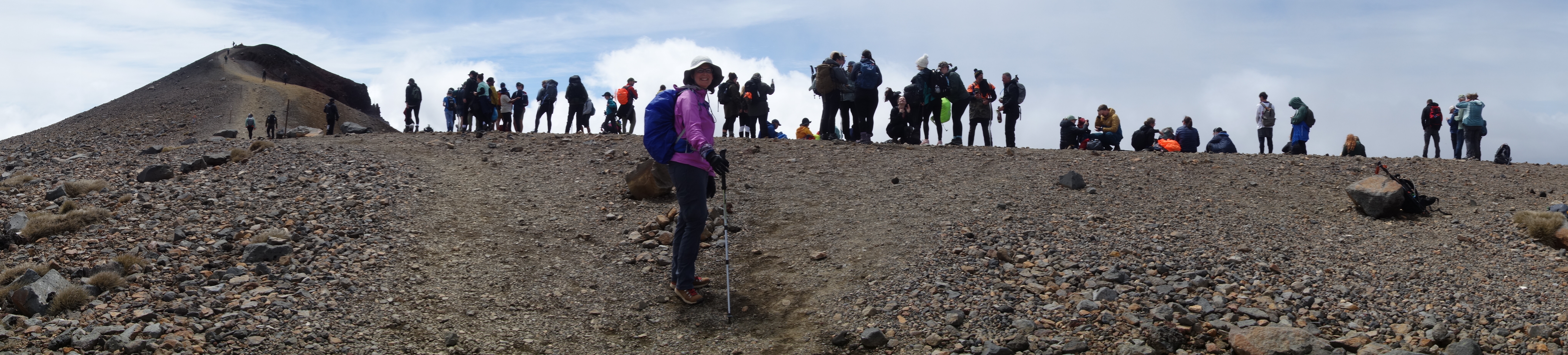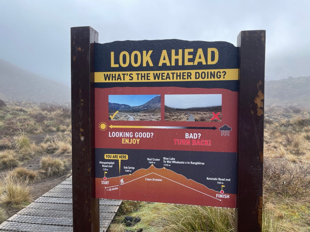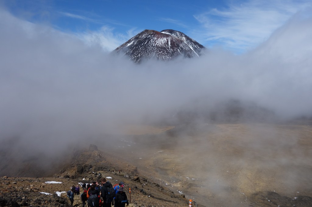 We were up before 6 am so as to get a timely start. The trail crosses from one side of the Tongariro range to the other, and is about 20 km long. Most people park on the northeast side and hire a shuttle service to bring them to the trailhead on the southwest side, so that the hike takes them back to their cars. The trail is extremely popular: around 150,000 people hike it each year. Given the limited number of days when the trail is open, that means potentially a thousand or more hikers on any given day. It certainly felt at times more like a mass migration than a wilderness hike — for the first half of the day it was rare not to see any other hikers, and many times we could see groups of 20 or more at once. With so many people it is inevitable that some will be less prepared than others. Although we were dressed in good outdoor gear and had brought plenty of warm clothing, we saw others dressed in cotton sweats and sneakers. The trail managers have posted a number of helpful signs on the mountain to help ward off trouble, encouraging people to turn back if they are feeling tired early on, or if the weather looks bad. We appreciated the irony of the sign below; despite the appearance of the trail ahead we knew that the forecast predicted that the mist would soon lift. And sure enough it did, finally clearing enough to reveal the summit of Mt. Ngauruhoe to our south.