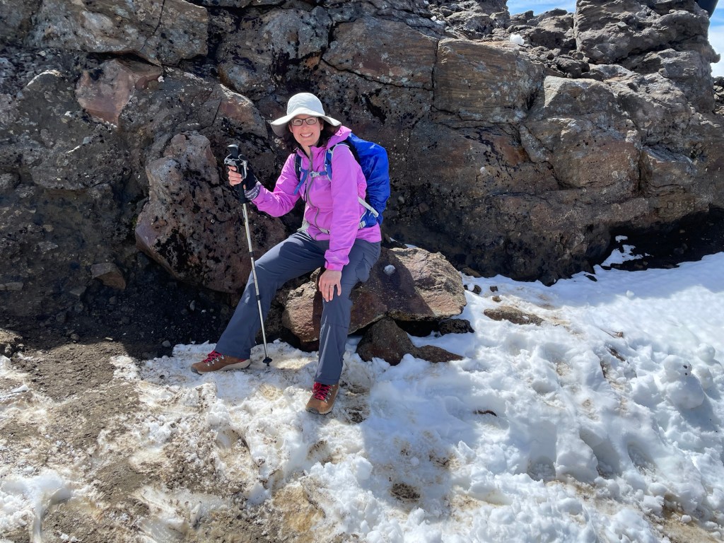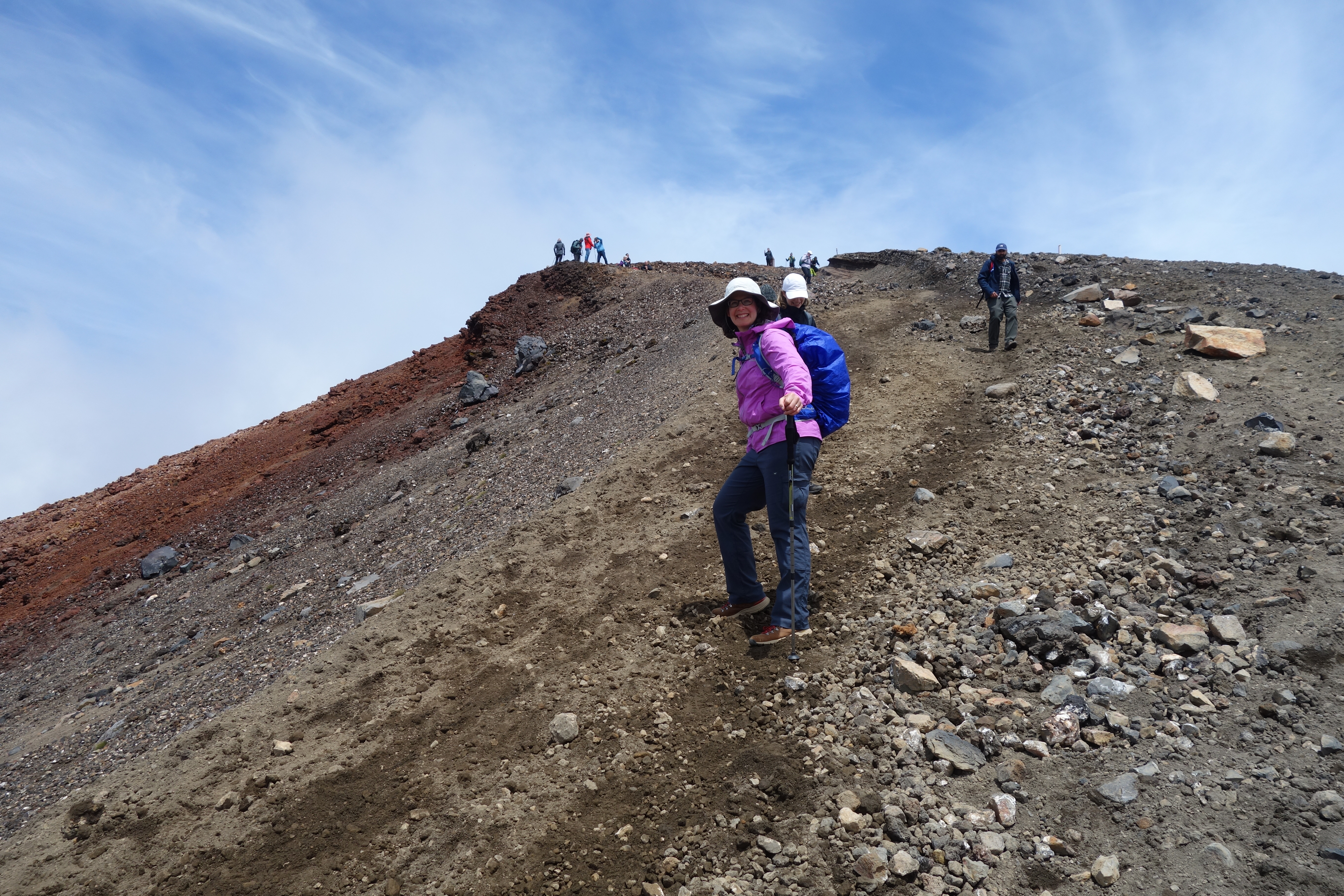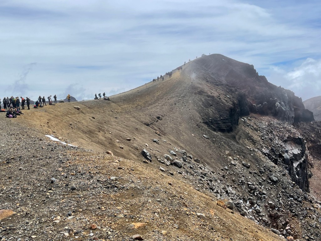 From there, we hit the steepest part of the trail, continuing up past patches of snow until we reached a ridge where many people seemed to be resting. When we got there, we had our first view of the Red Crater, where we too stopped for lunch. This crater is one of the youngest on the volcano. Its deep red color comes from a combination of iron in the rocks and extreme heating.