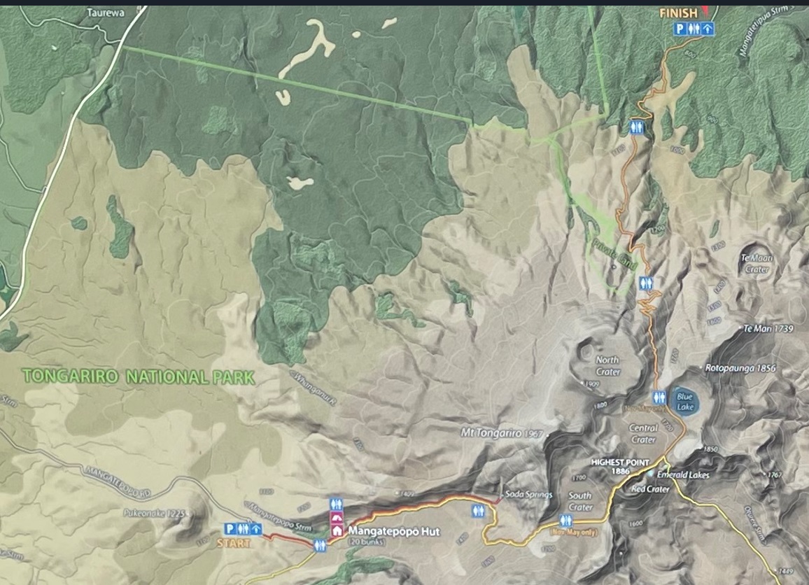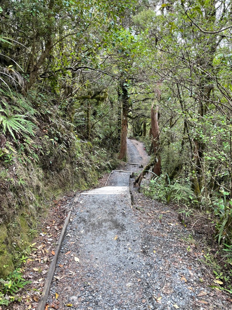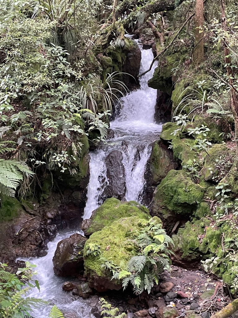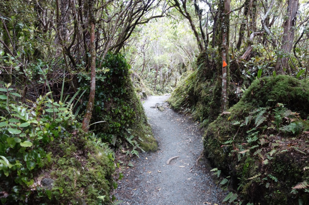 The trail down from Tongariro descends over 1100 meters. At the start we were in an alpine zone, with only short hardy plants growing low to the ground. As we continued, a brushy zone grew up around us, and then rather suddenly we found ourselves in a bush forest again, with tall trees, many ferns, and moss on seemingly every surface. Soon we were following a rushing mountain stream. Despite its beauty, signposts told us that several times in recent history, the valley had seen deadly lahars pouring down it — mixtures of mud, water, and rock that smother everything in their path. Fortunately, none decided to visit today.
