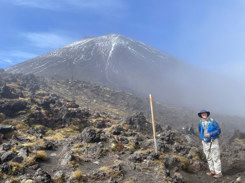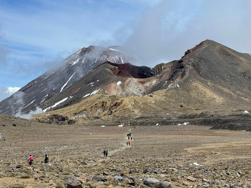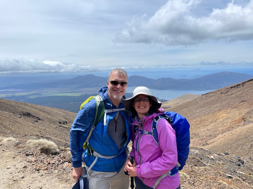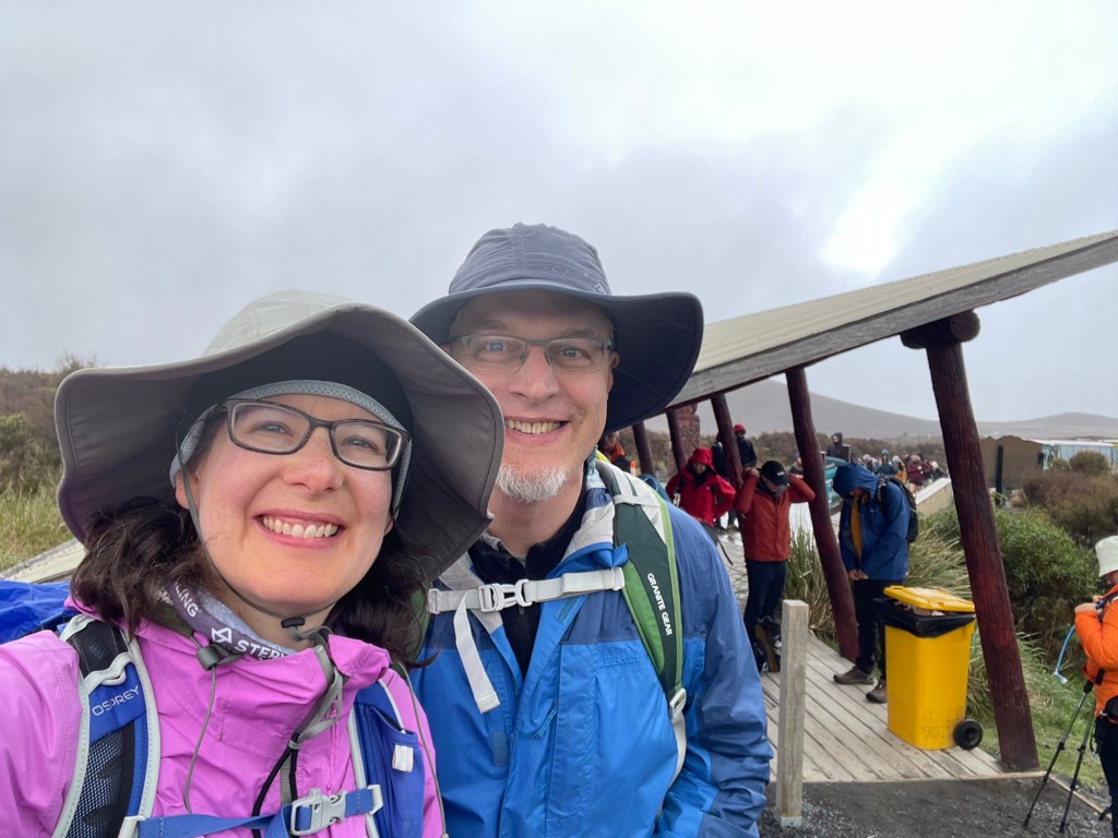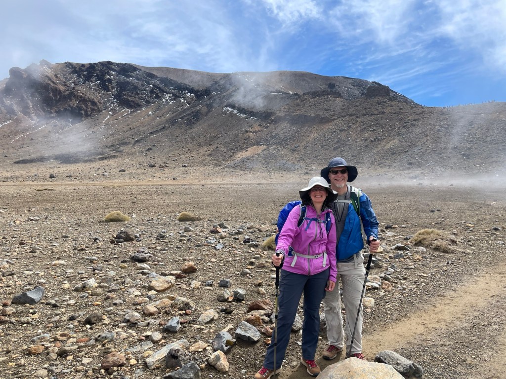 Tongariro National Park is New Zealand’s oldest, established in 1887 — five years after Yellowstone in the United States. It is also known for its role in the Lord of the Rings movies; multiple scenes were shot here, including the climactic moments with Sam and Frodo on Mount Doom. The volcano last erupted in 2012 (on Susannah’s birthday, of all dates!), spewing rocks high into the air from Te Maari crater. We passed by the pit left where one had landed; it was several meters across. On our own hike, things seemed mostly quiet aside from some steaming fumaroles. We did hear a loud boom at one point that had us looking around nervously, but saw and heard no other activity.