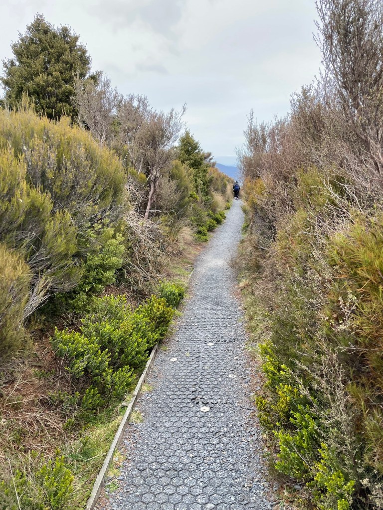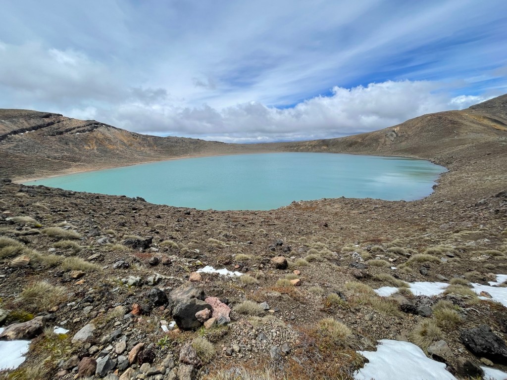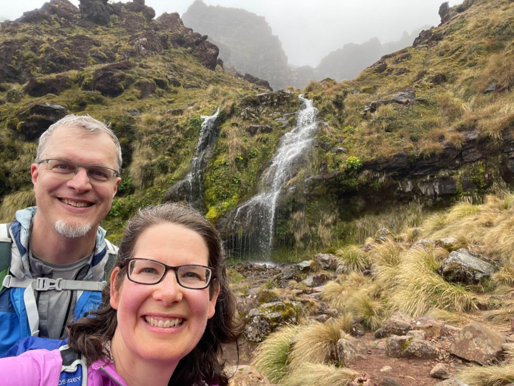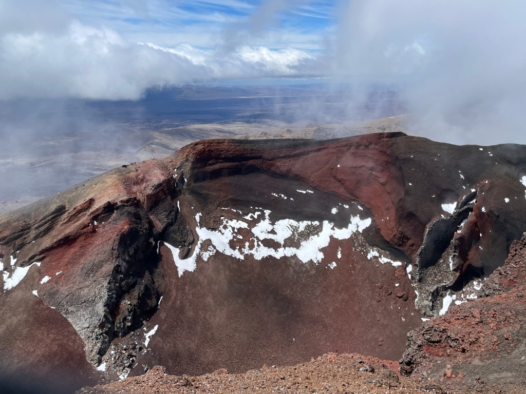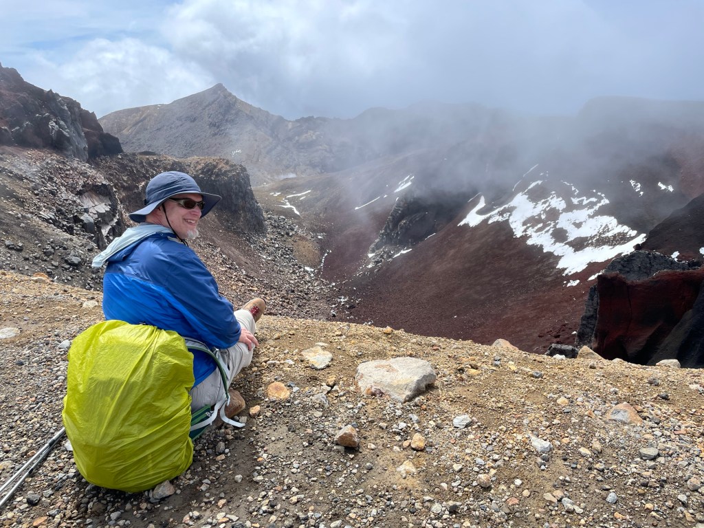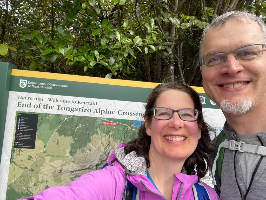 Tongariro National Park is New Zealand’s oldest, established in 1887 — five years after Yellowstone in the United States. It is also known for its role in the Lord of the Rings movies; multiple scenes were shot here, including the climactic moments with Sam and Frodo on Mount Doom. The volcano last erupted in 2012 (on Susannah’s birthday, of all dates!), spewing rocks high into the air from Te Maari crater. We passed by the pit left where one had landed; it was several meters across. On our own hike, things seemed mostly quiet aside from some steaming fumaroles. We did hear a loud boom at one point that had us looking around nervously, but saw and heard no other activity.