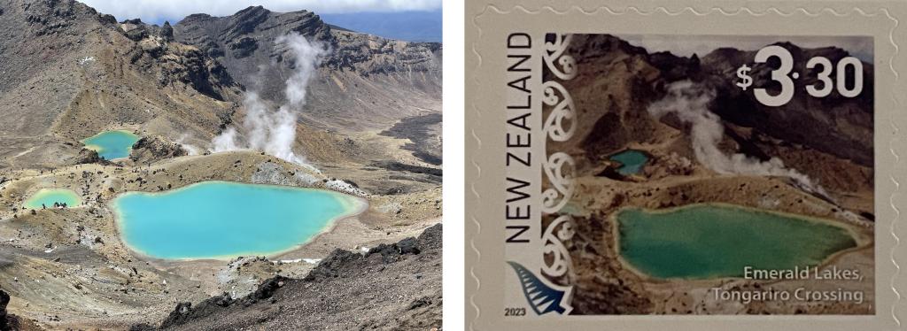 From our lunch spot it was just a short walk to the high point of the trail at 1868 meters, before a very slippery descent down the other side towards the Emerald Lakes. We were very thankful to have poles, though Susannah still managed to end up on her backside once during the descent. The Emerald Lakes are an iconic view in New Zealand, even featuring on their international postage stamps. (Do you like our photo better?)