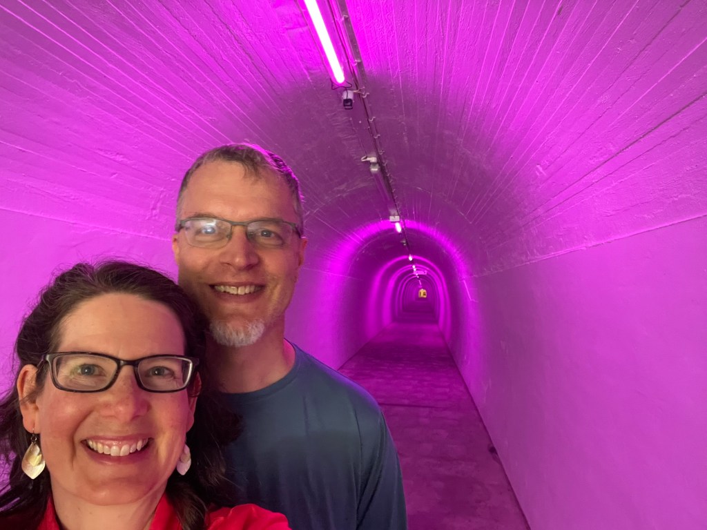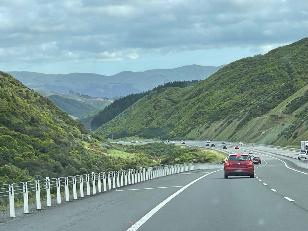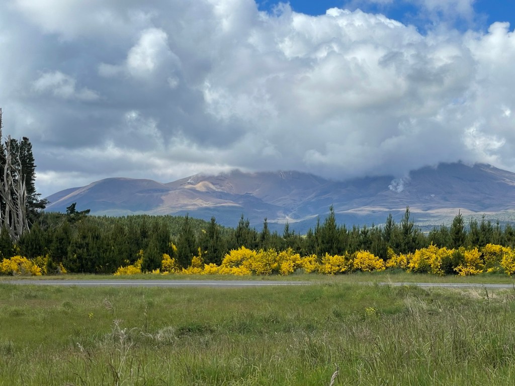 Doesn’t everyone like a road trip? Today we packed up and headed south to Wellington, at the southern tip of the North Island. The first part of our journey passed once more through the Tongariro National Park, which is actually quite large. We said goodbye to Lake Taupo for the last time and began our drive with a large loop around the volcanic range that we had just crossed the day before. The roadside in this region is lined with shrubs bearing bright yellow flowers. We learned later that this is Scotch broom, which is considered invasive, but it sure looks cheerful at this time of the year.