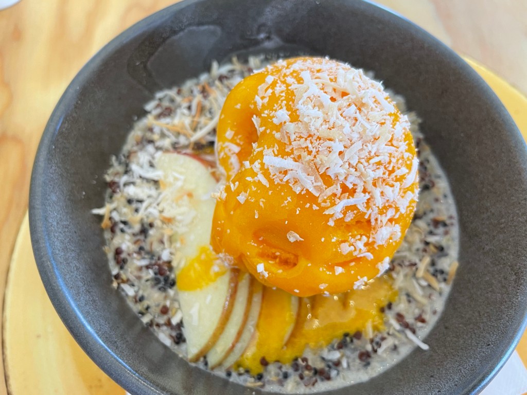 After a morning’s travel on a winding road through hugely scenic (but hard to photograph) farmland and river valley, we stopped about halfway through the drive in the seaside town of Whanganui for lunch and a chance to stretch our legs. The Yellow House Cafe where we ate offered a number of interesting dishes, including this quinoa porridge topped with thinly sliced apple and a scoop of mango sorbet.