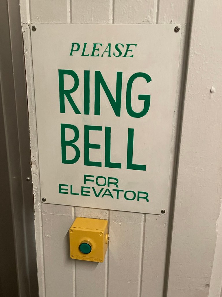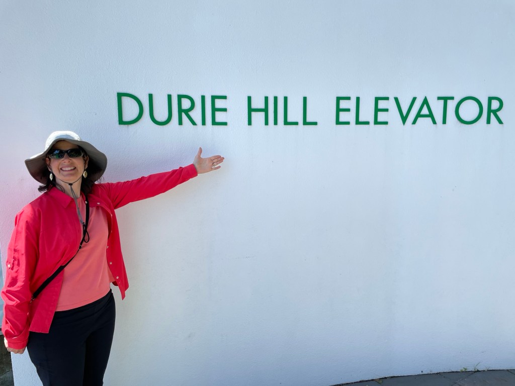 The city of Whanganui has a number of attractions dating to the early 20th century, including a trolley museum we didn’t visit. (You can ride the trolley on an extremely short semicircular track that stretches for about half a block.) Instead we headed for the suburb of Durie Hill across the river, which is serviced by a unique form of public transit: an underground elevator. (Well, unique in New Zealand anyway; apparently there is one other such installation in Lisbon, Portugal.) The elevator is accessed via a tunnel at the base of the hill; walking it takes you eventually to the base level, where you ring a bell for the operator and wait about a minute until the lift arrives. We paid our $2 fare and rode to the top. On the way, the operator told us that many people use the service to commute to work, and children ride it to school in the morning along with their bicycles. Who knew? The construction of the elevator was associated with the the planned development of a “garden city” suburb at the top of the hill, an early example of successful urban planning. You can see the top of the elevator in the photo below. It’s the orange tower, and houses the machinery (mostly original) that makes the lift run.