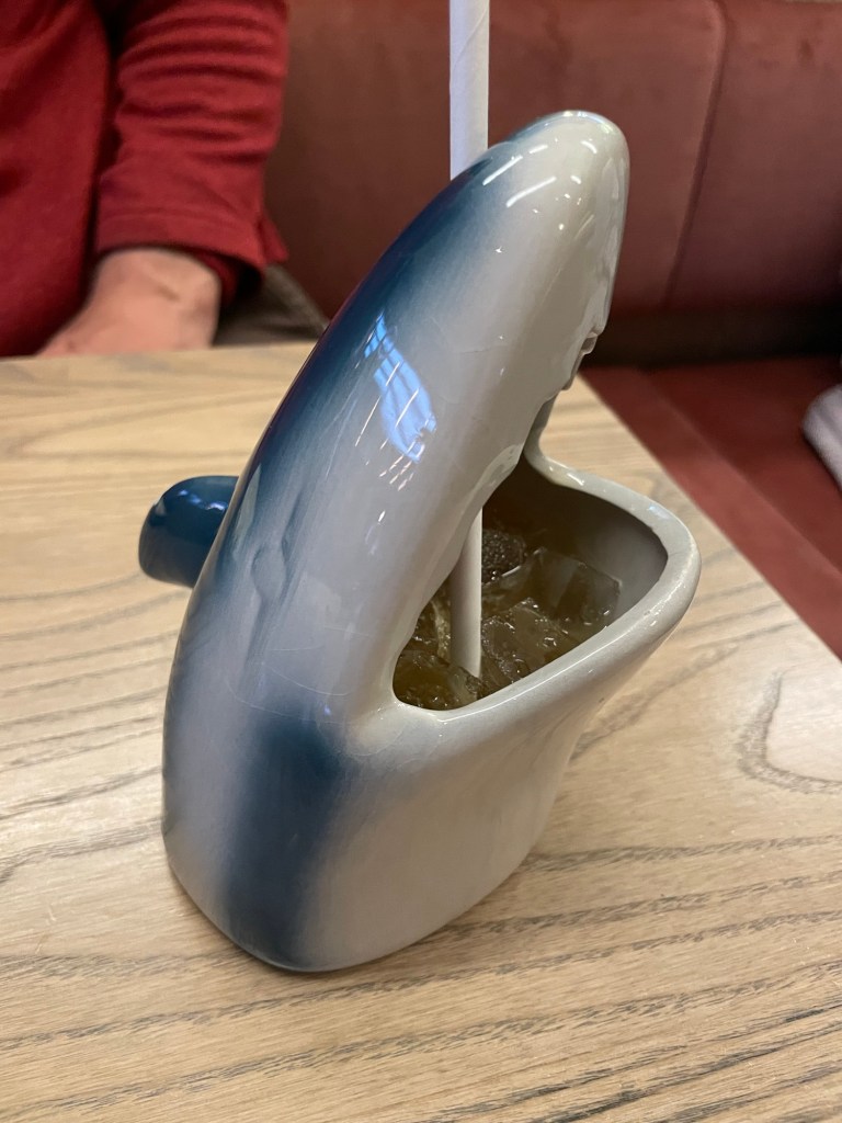 After several more hours drive we finally reached Wellington, where we turned in our rental car. The studio apartment we are staying in is right in the center of the city, surrounded by great restaurants. On the recommendation of a friend of Rowan’s who is a Wellington local, we ate at Mr. Go’s, an Asian fusion cafe that offers tapas-style dishes and also creatively-named cocktails served in fanciful vessels. We were tempted by the “Prayers of the Soulless” but in the end settled on the “Grandpa Shark,” which included spiced rum and passionfruit juice. For the record, it was delicious.