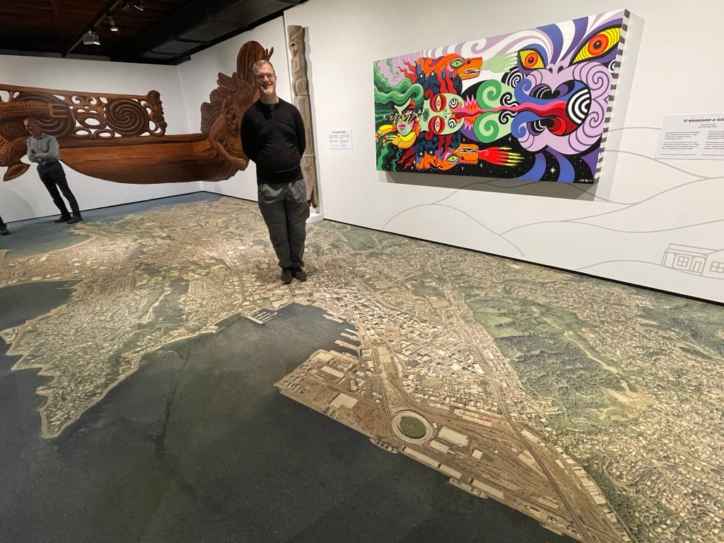 We spent today exploring Wellington on foot. Literally so, in the case of the photo above — the Wellington Museum has a large room carpeted with an aerial map of the city. Nick is standing in the middle of the central business district, roughly where our lodging is located.