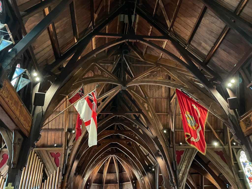 We reunited for an official mid-morning walking tour of the city. Our guide was a longtime resident, and shared her personal reminiscences as well as the official tour information. We began at the waterfront near the Te Papa national museum, worked our way through the central business district to the houses of Parliament, and finally ended at Old St. Paul’s Cathedral, a wooden structure that looks rather modest on the outside but has beautiful wooden timber vaulting reminiscent of a ship’s hull hidden within.