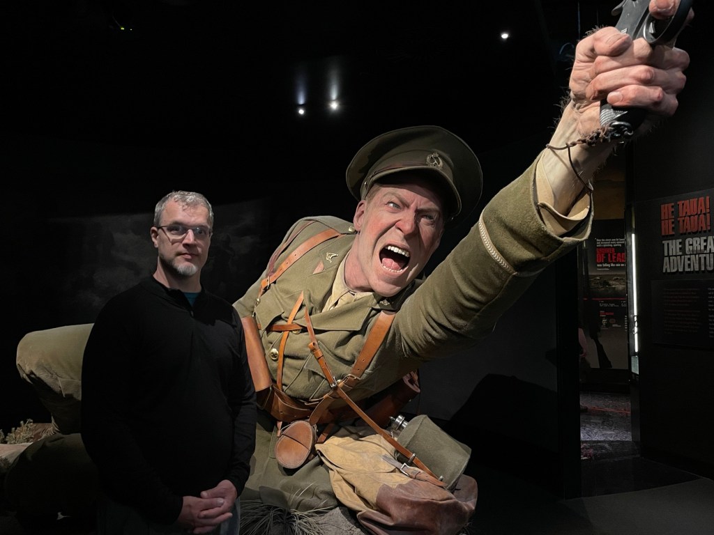 In the afternoon we visited Te Papa, the national museum. They had recently installed an exhibit on the disastrous Gallipoli campaign of World War I, in which soldiers from New Zealand and Australia played a significant role. The exhibit featured larger-than-life models of some of the combatants, rendered in exquisite detail by Peter Jackson’s special effects studio Weta Workshop. The displays were paired with the actual words of the depicted subjects.