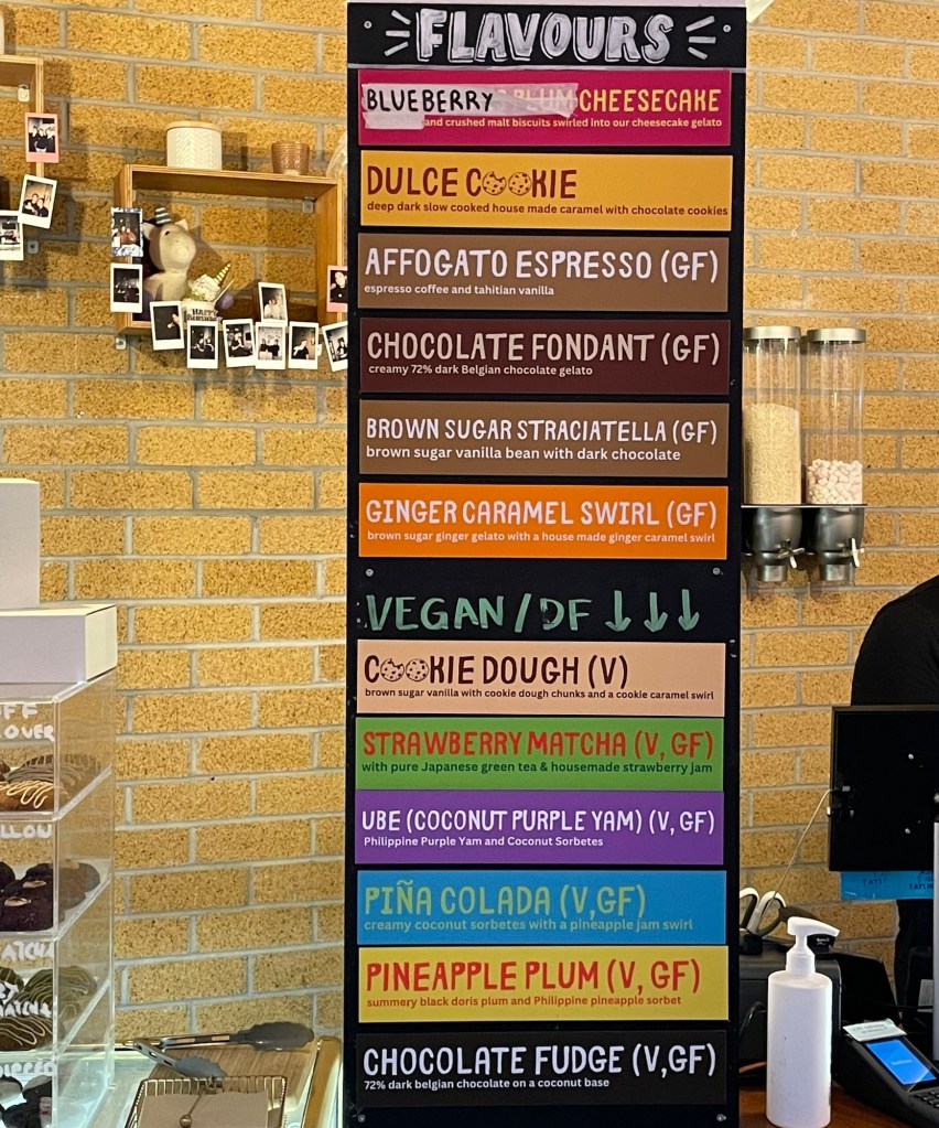 After dinner at a pizza restaurant that used homemade sourdough for their crust (another fine recommendation from Rowan’s friend), we rounded off our meal by tasting some of the unusual flavors on sale at our corner gelateria.