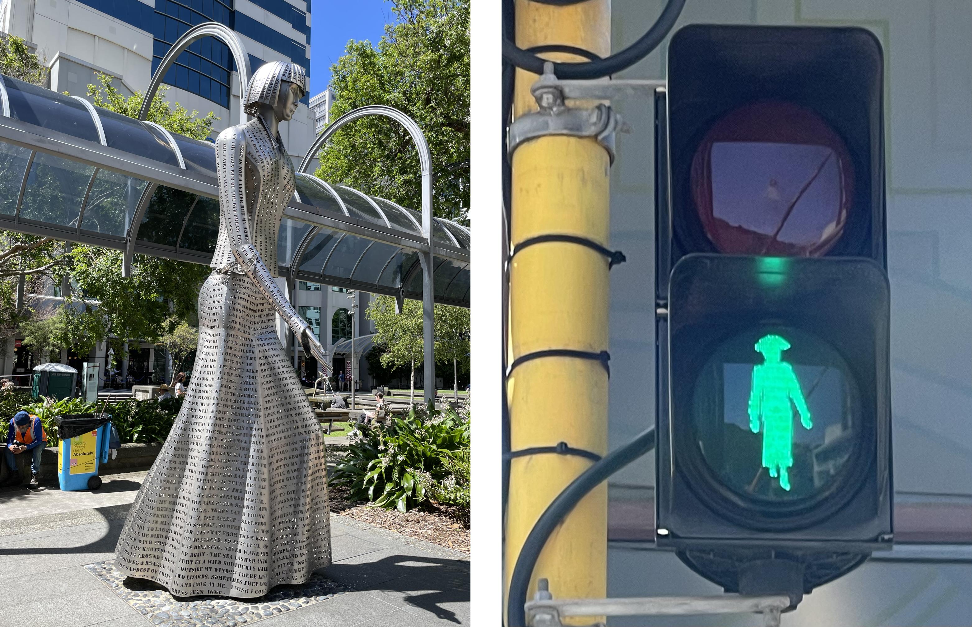 We learned about some of the women who played a significant role in NZ history. We liked this sculpture of Katherine Mansfield, a celebrated writer. The words laser cut into steel are taken from her journals and short stories. We also learned about Kate Sheppard, a suffragette who biked around the country collecting signatures for the petition to allow women to vote. In the end she got over 30,000, around 3% of the population at that time. Some of the walk signals at crosswalks feature her silhouette, a move that is intended to encourage people to vote.