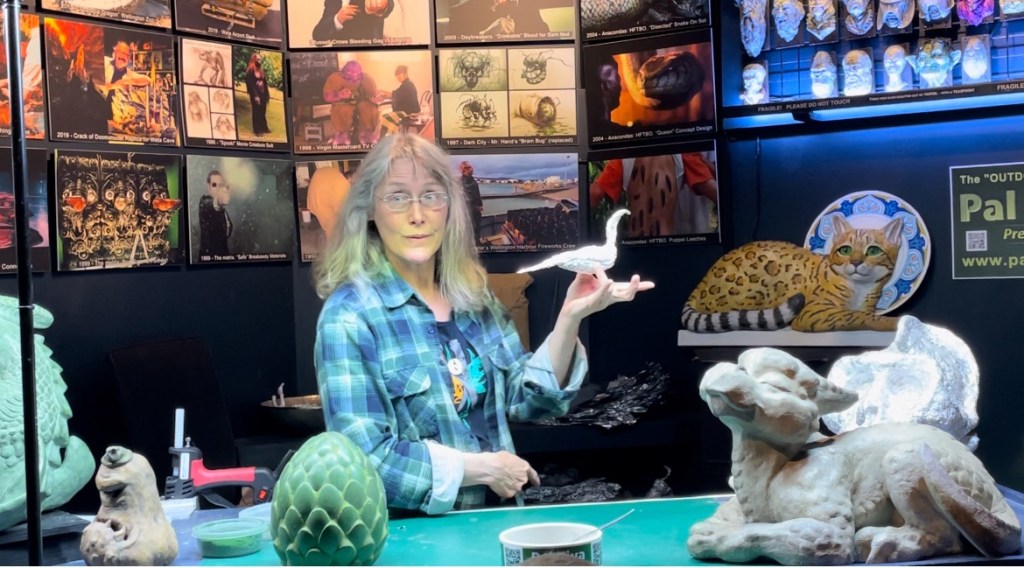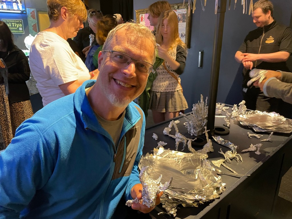 A feature of the tour that was particularly interesting: they included several Weta model-builders at work, who showed off their work and explained it to us. The second of these had us all try our hand at sculpting with aluminum foil, which is apparently a very versatile medium and used by the professionals for some of their work. We didn’t have the time to try anything too fancy, but did put together somewhat recognizable versions of a turtle and a dragon head.