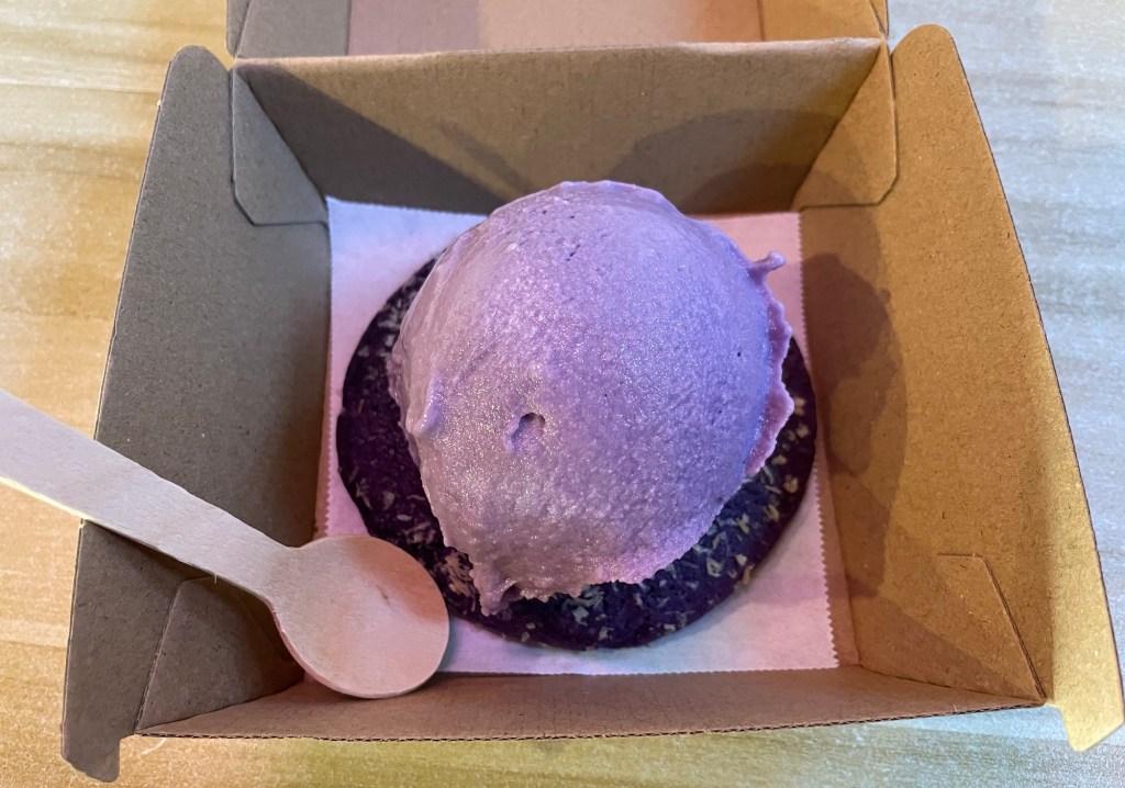 On the way home we took the cable car together. After a stroll back through the city past the famous splash-bucket fountain on Cuba Street, we had a delicious dinner at the Ethiopian restaurant downstairs from our lodging. We wish we had one of these at home! Dessert (back at the excellent gelato place from the night before) was ube+coconut flavored vegan ice cream and cookie, which was a hit with Susannah. Ube is a type of yam native to the Philippines. Yes, it’s really that purple!