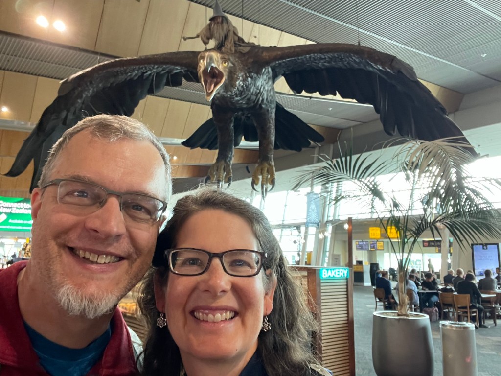 Early this morning we said goodbye to Wellington, caught the bus to the airport, and boarded a plane for the South Island. While in the airport we ran into a few lifesize emissaries from Weta Workshops, who must have been there to see us off.