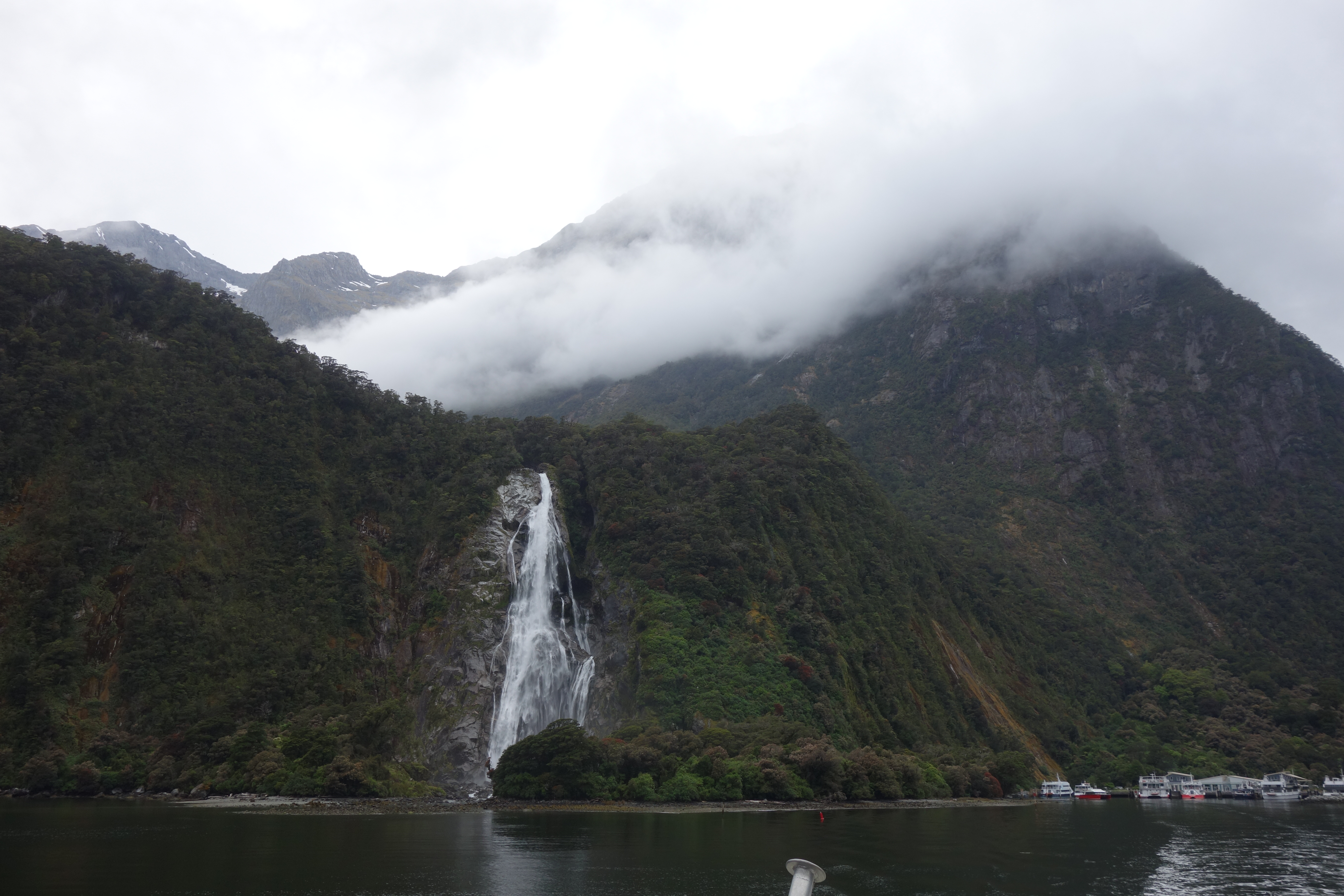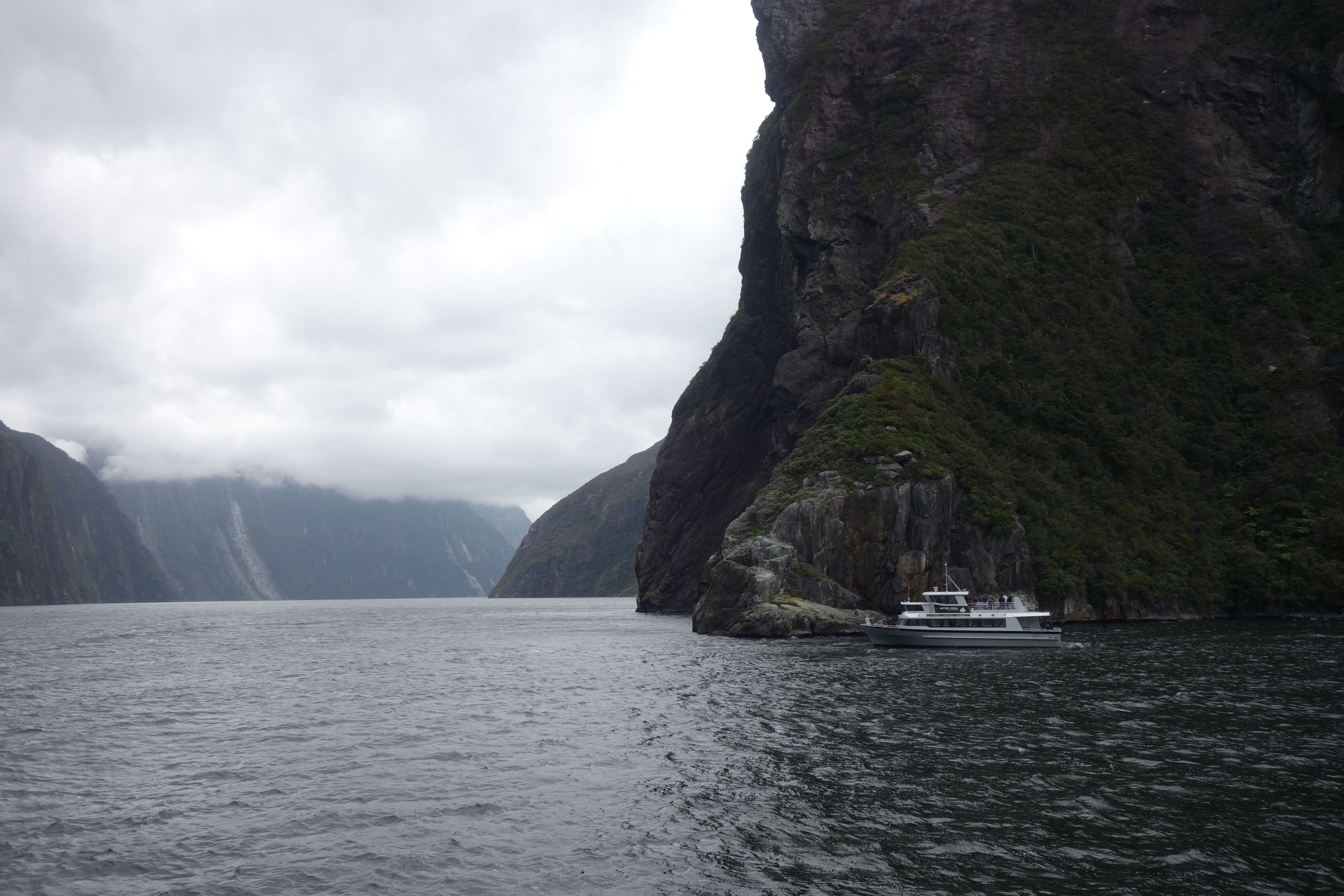 Most people who come to see Milford Sound do so by boat, and this morning our group joined them. Boarding the MV Sinbad, we took to the waters once again for a roundtrip cruise out as far as the mouth of the sound and back again. Along the way our boat tour guide told us details about the geology, history, and biology of the sound. Since it had not rained in four days, many of the waterfalls that sometimes decorate the cliff faces were not running, but there were still a few to see. We also glimpsed dolphin fins as they surfaced to breathe, and a trio of fur seals sunning themselves on a rock.