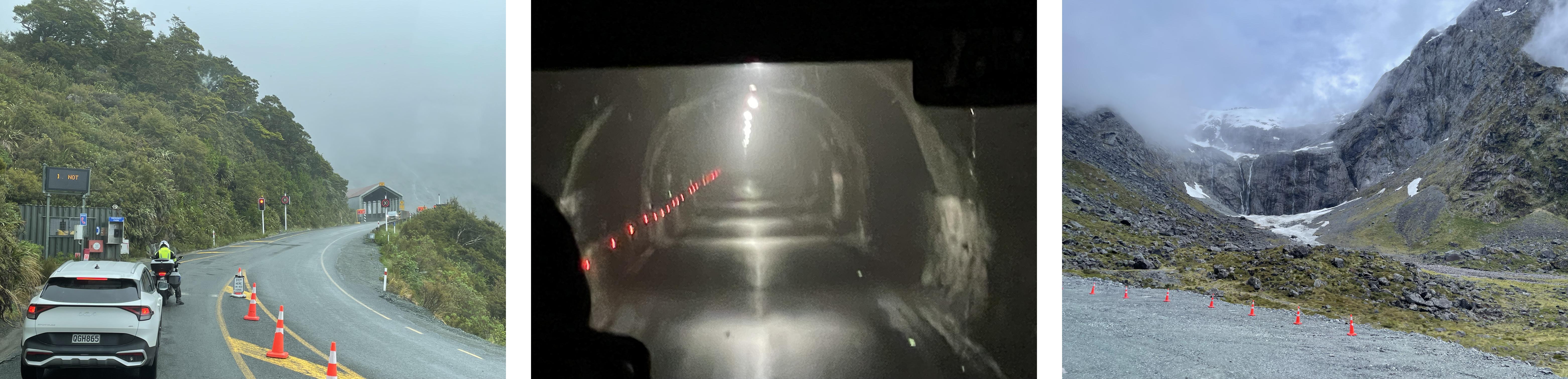 Following our boat tour, we all boarded our bus for the long trip back to Queenstown. The route passes through the Homer Tunnel before turning south, passing the landing where we began our trip, and retracing our path home. The Homer Tunnel was finished in the 1950’s in conjunction with the opening of the park, and was a difficult project. Besides contending with avalanches that killed several of those working on site, the miners discovered that the tunnel was filling rapidly with water as they dug due to its downward slant. In response, the dimensions were decreased so that they could finish the bore and allow water to drain. There had been a plan to widen it to the full original width after the fact, but as of our trip today it is still a one-lane tunnel nearly a mile long.