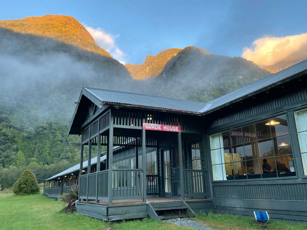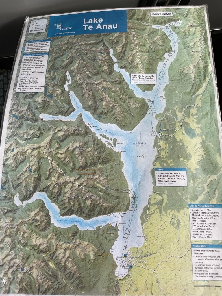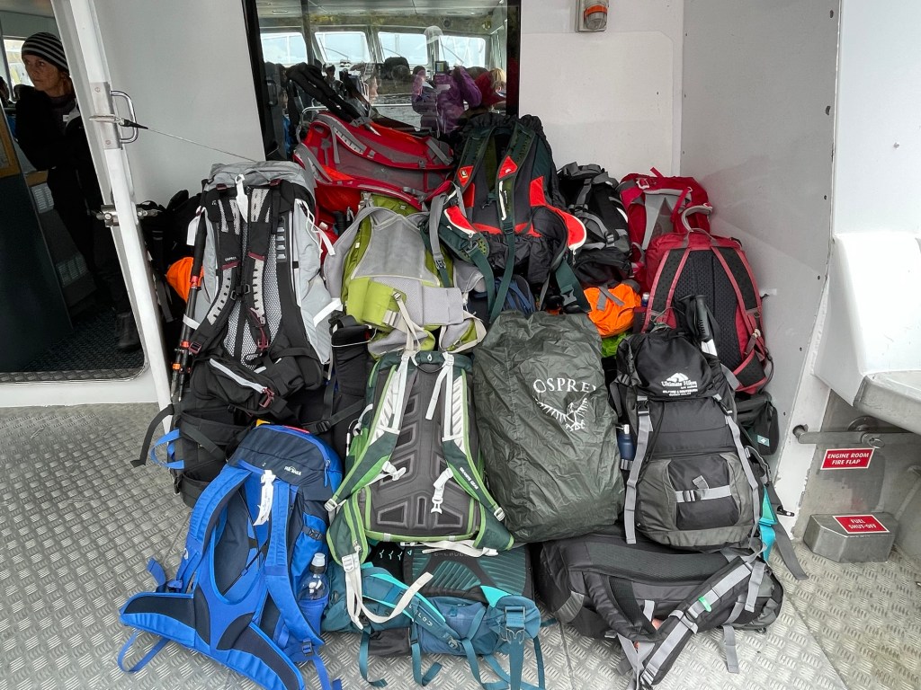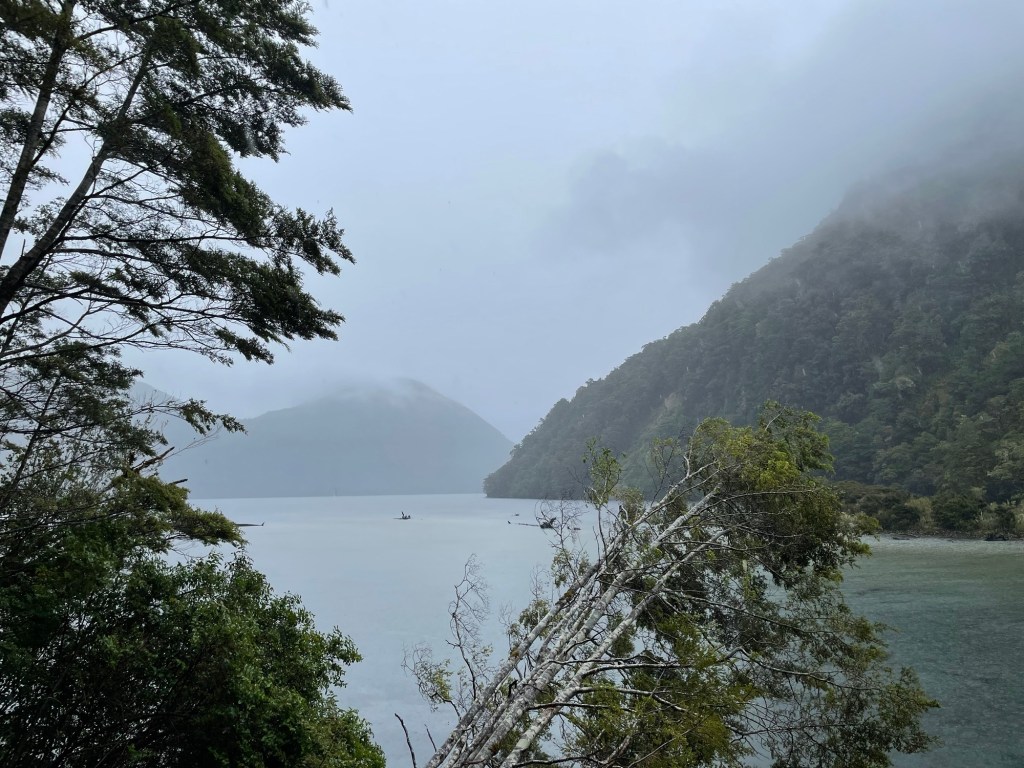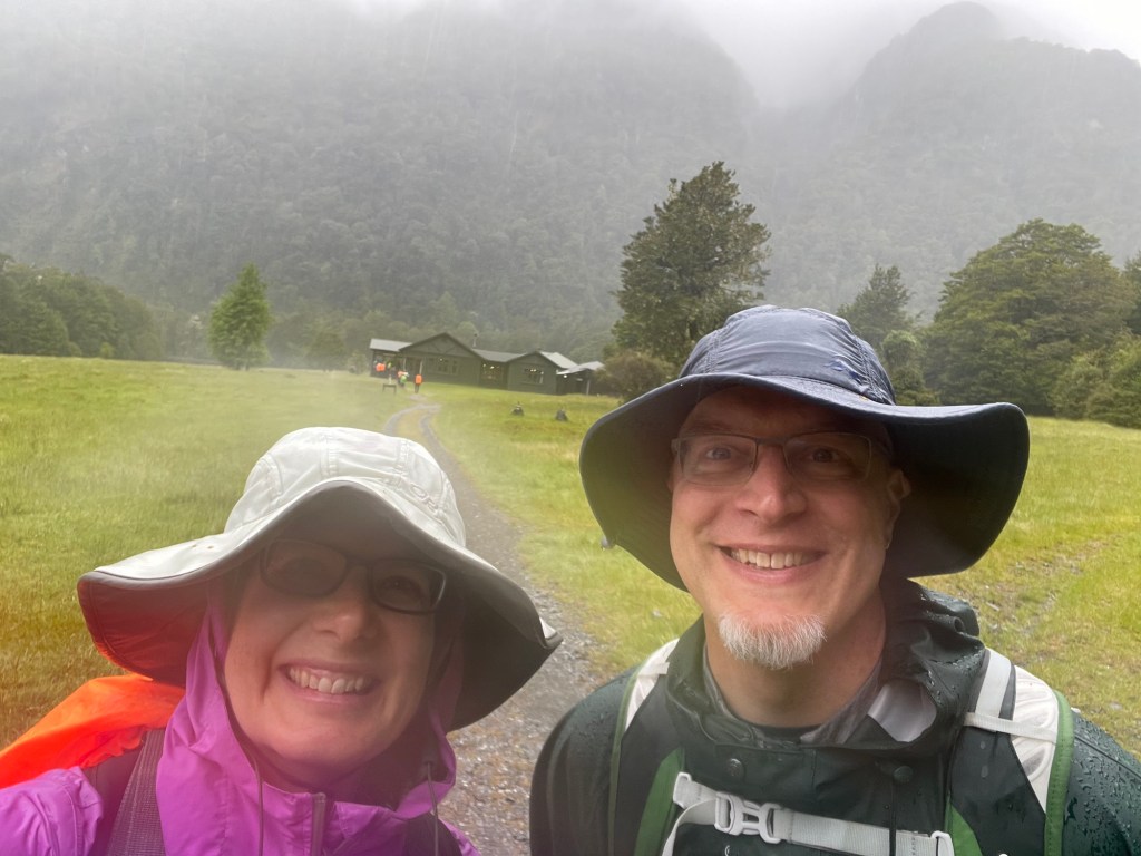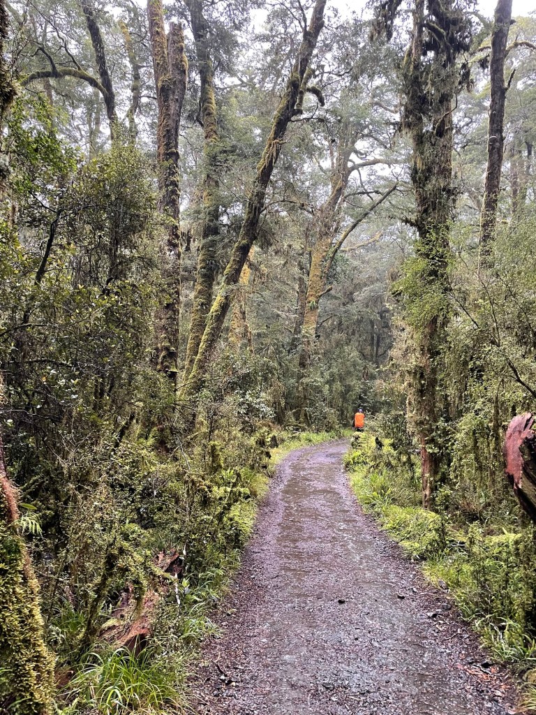 Getting to the starting point of the hike takes most of a day; the straight line distance is not too far, but by road, the bus travels around three sides of a square. Even that doesn’t get us all the way there, so after a long bus ride we all climbed into a boat for the remainder of the trip to the northern tip of Lake Te Anau. We boarded at Te Anau Downs, about halfway up the eastern side of the lake, and voyaged through the fog all the way to Glade Landing at the northern tip. Lake Te Anau is the second largest lake in New Zealand by surface area but because it is deeper, it holds the most water. Unlike Lake Taupo, which is a volcanic caldera, this one was carved out by glaciers. We’re on the edge of Fjordlands National Park, fabled for its steep cliffs, snowy peaks, and majestic sounds, and on a clear day the views would be magnificent. We didn’t see much of anything today thanks to the low cloud cover, fog, and steady rain. But the forecast is for more sun in the days to come, and this way we got to test out all our rain gear right up front! The lodges all have specially-designed heated drying rooms for wet clothing and gear, so we can always start each day perfectly dry.