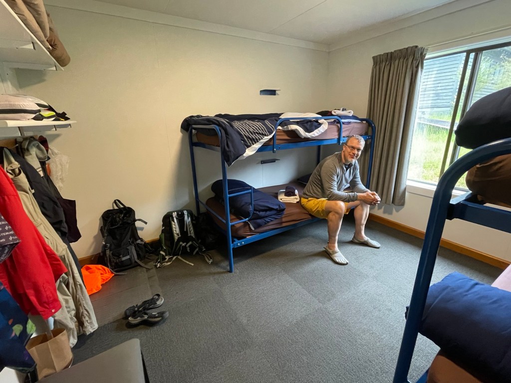 After all the travel by road and boat, we had only a one mile hike to reach the first lodge, so we’re not feeling the burn yet. We did see our first wild ground bird, a weka, which scampered across our path. At first glance we took it for a rabbit but quickly realized it was something else entirely. Another detail: as we all disembarked from the boat, we had step in tubs of sanitizer and also dip our pole tips to prevent the spread of didymo to the pristine watershed. (We’re told that the stream water on this trip is currently clean enough to drink, and the trail managers aim to keep it that way.)