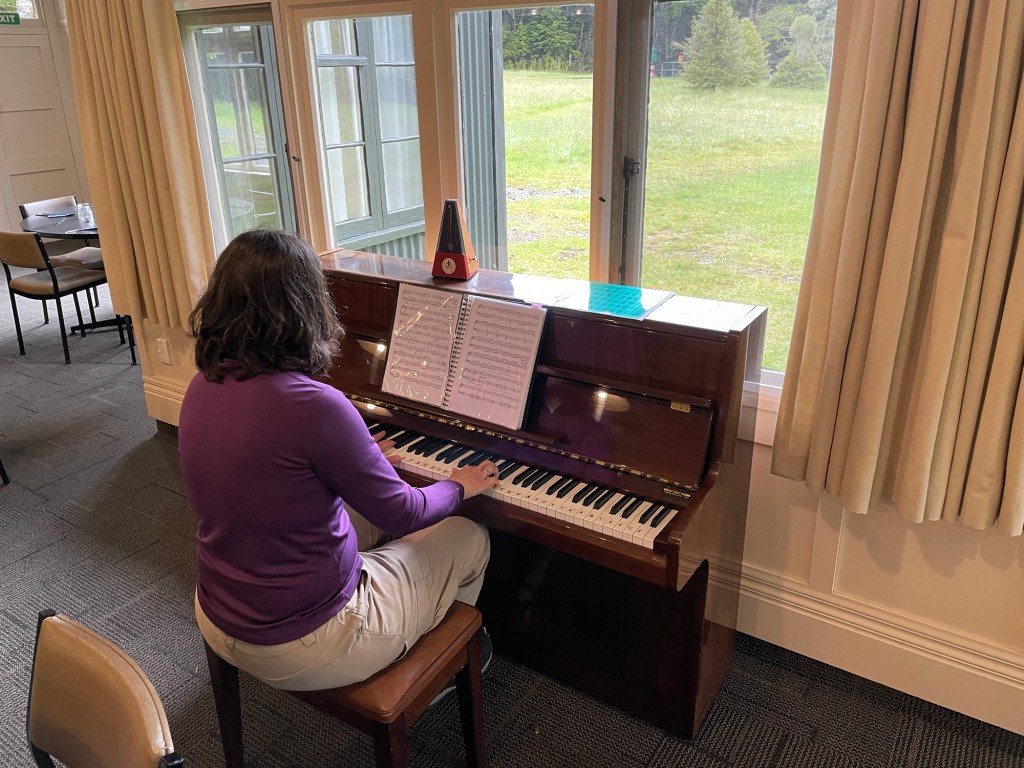 Our stop for tonight was Glade House, a lodge first built around the turn of the 20th century on a grassy meadow beside the Clinton River. This is the third instantiation of the lodge, the first two having succumbed to fire. As one sees it now, the large central common room is surrounded by a warren of bunkhouses, private cabins, and other service rooms. It offers many amenities, including tea at 4 pm, a bar that opens at 5, and dinner service at 6. There is also a host of board games, a guitar, and a piano for common use. Susannah took a stab at some of the available sheet music, with great joy. They also have a small museum, containing memorabilia and historical photos from early days of the track. In one of the books on hand around the lodge, we came across a rather ominous-sounding poem.