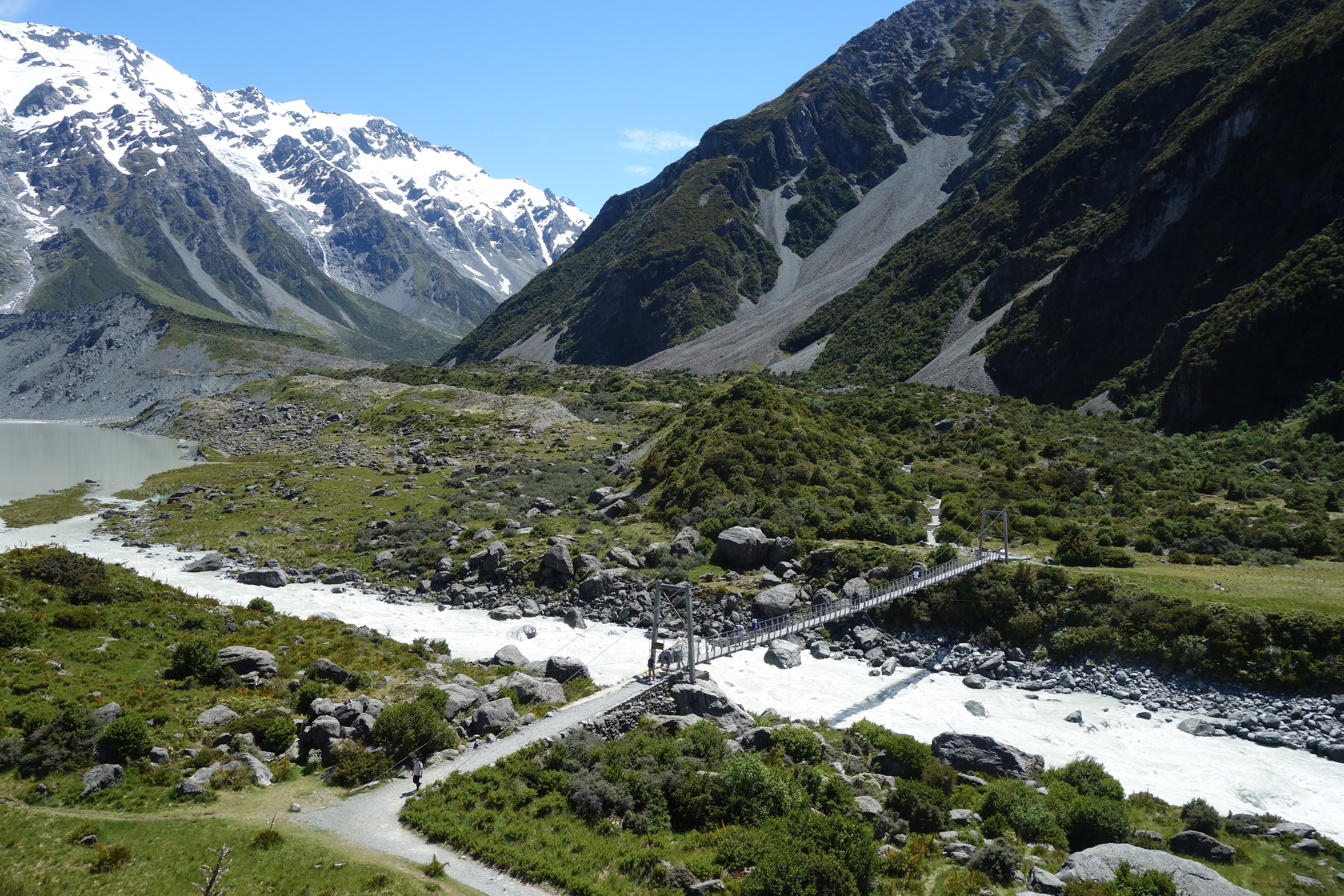 The Hooker Valley Track which we walked today travels about 5 km from the car park to the shores of Hooker Lake, one of the glacial meltwater lakes surrounding Aoraki. It is a very popular route, and we shared the trail with lots of other hikers who had come out to enjoy the warm and sunny day. The trail itself is fairly easy, without much elevation change. It crosses rushing meltwater streams on three large swing bridges. The meltwater itself carries finely powdered stone scraped off by the glaciers, so much so that it appears a silvery grey color as it flows. The lakes have a slight greenish tinge (“like a matcha latte,” said Alison).