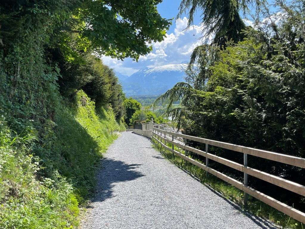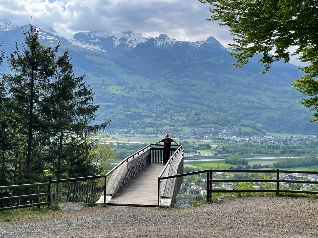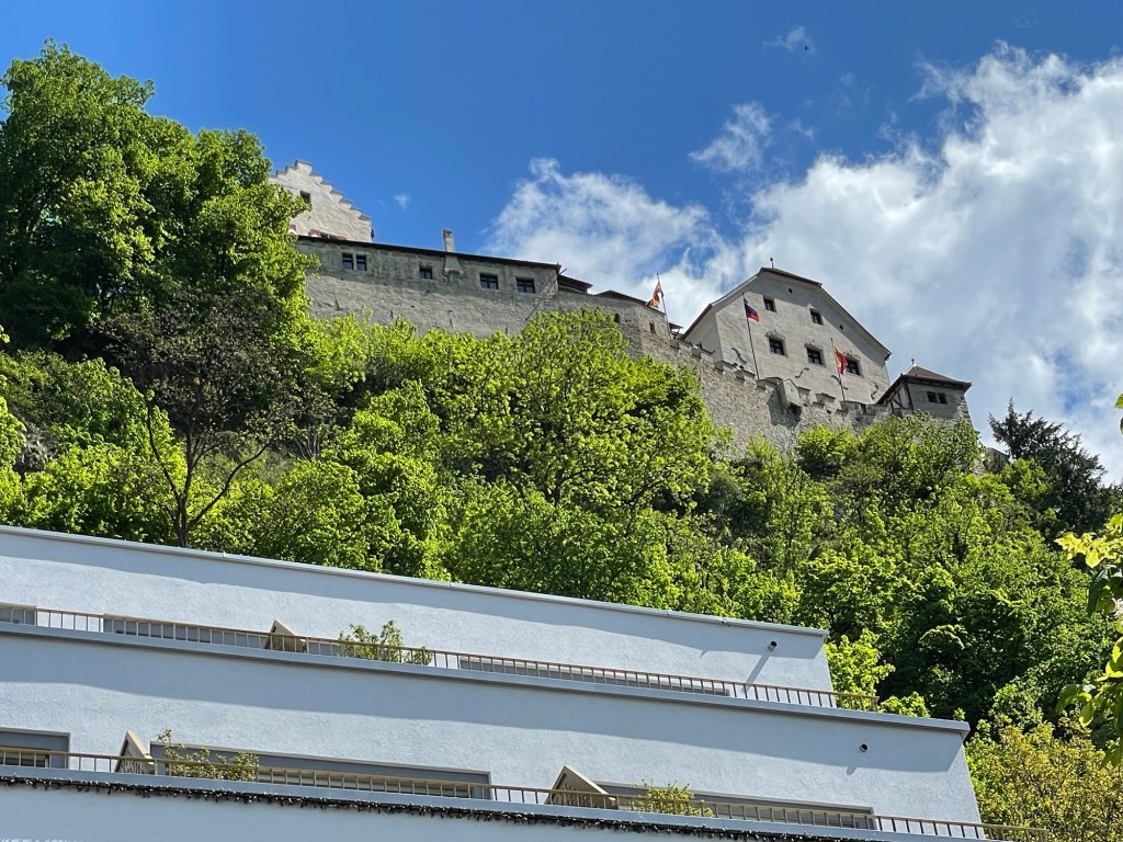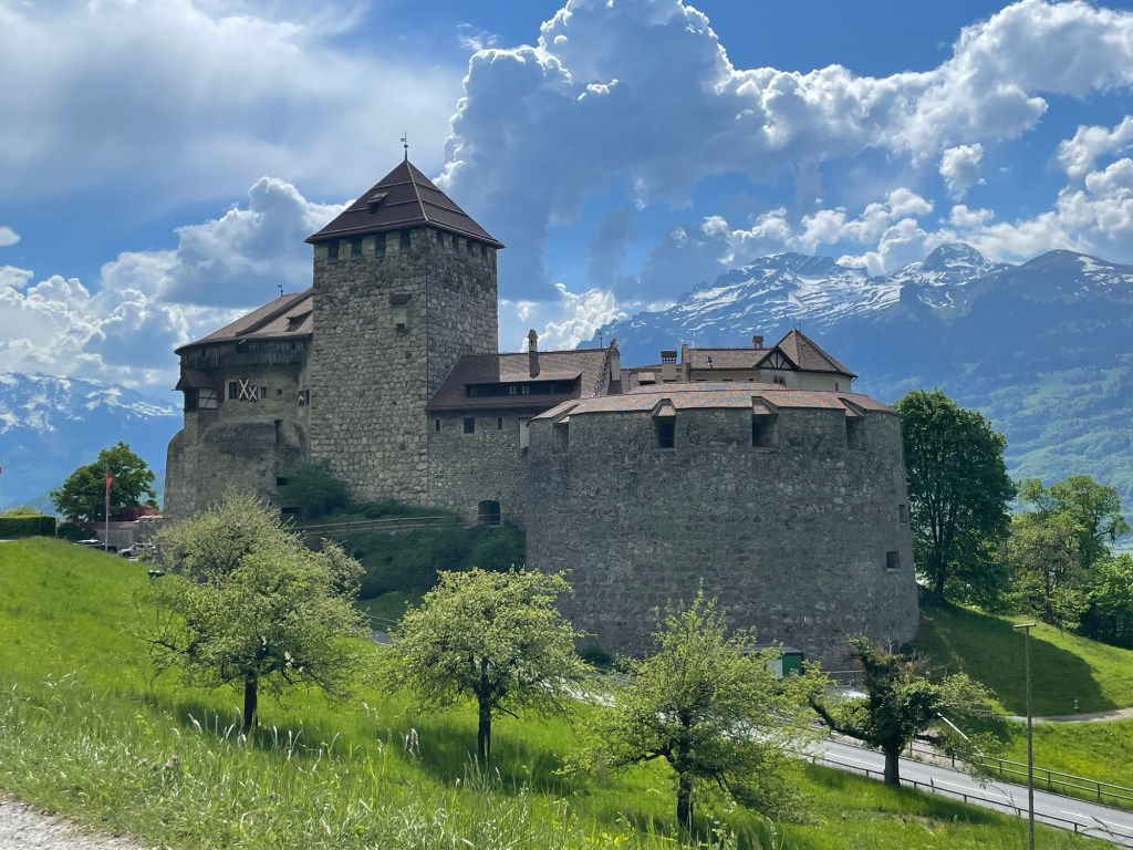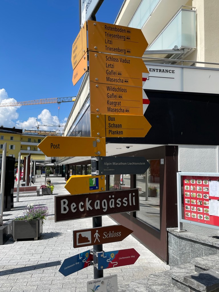 View of the castle from our lunch spotA signpost at the start of our walkThe WanderwegOutside Vaduz Castle. While we were there, another couple wandered into forbidden territory and were chased away by a loud voice announcing that they were trespassing and had been caught on camera.Best view of the castle from up close, with the Alps in the background.