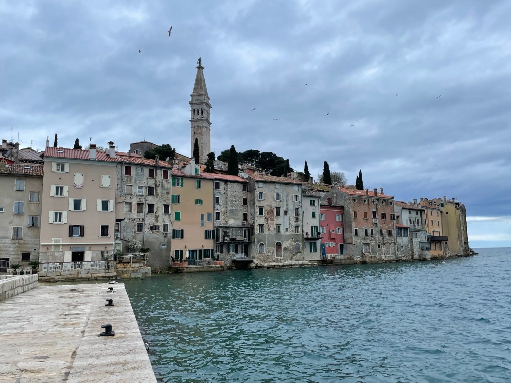 Rovinj seen from the north, with Saint Euphemia facing inland atop the steeple