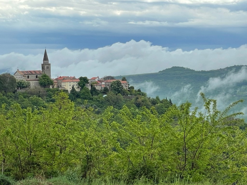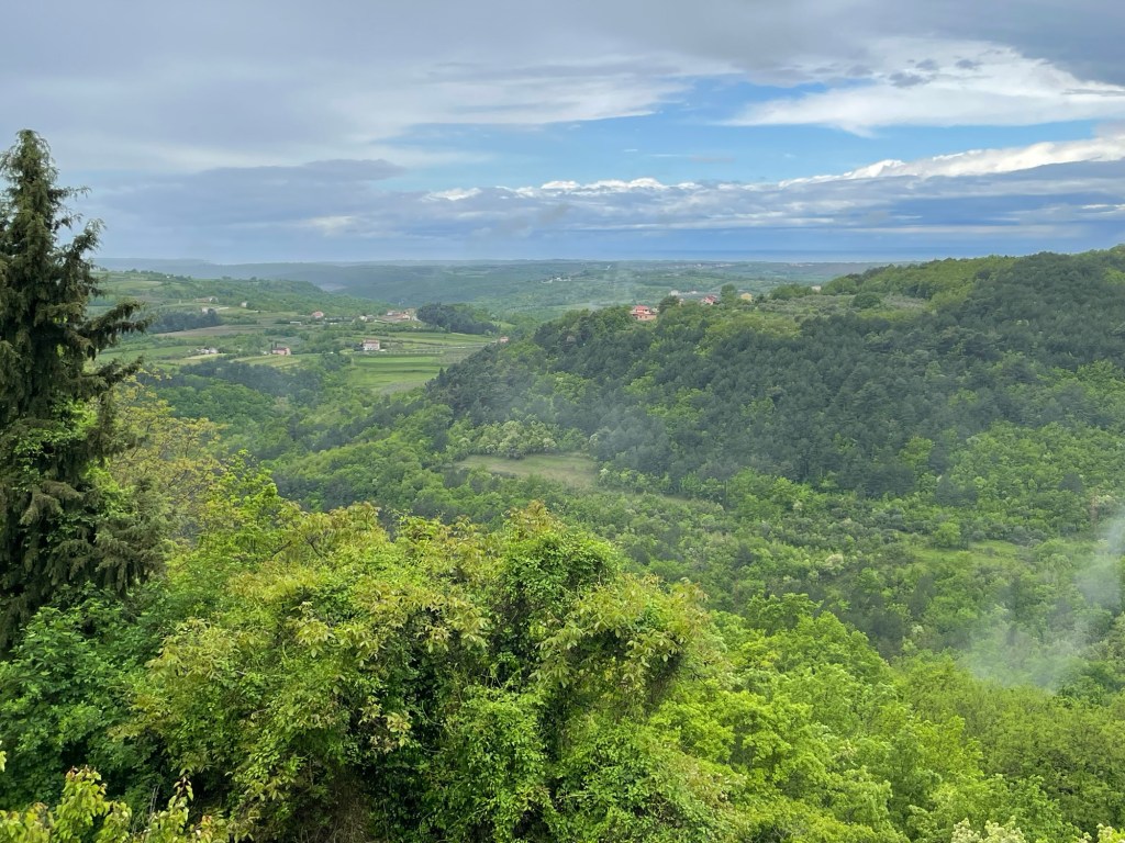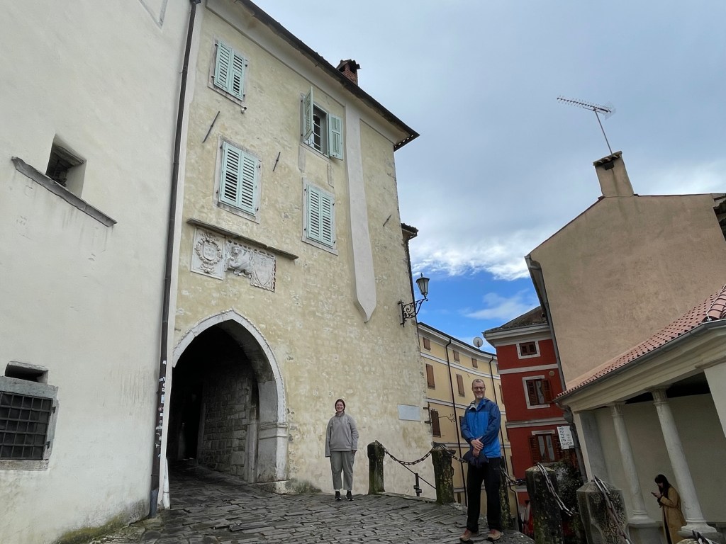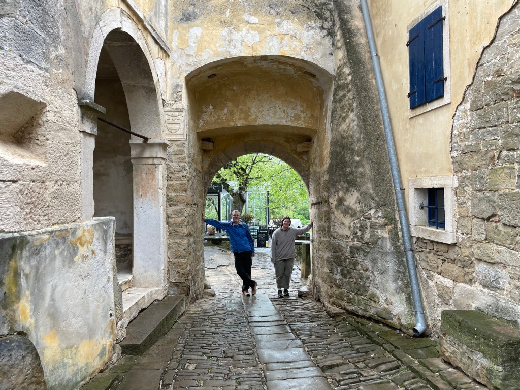 Our first two destinations were old hill towns to the north. Grožnjan is known as an artistic center, and features dozens of shops selling all manner of different art pieces — painting, glass, metalwork, jewelry, sewn crafts, etc., plus a handful of the usual tourist souvenir shops thrown in for good measure. We could tell that on a clear day there would have been excellent views in all directions, but today we were lucky to get enough of a break in the clouds to see the line of the next ridge. At least the rain mostly held back while we explored the town.