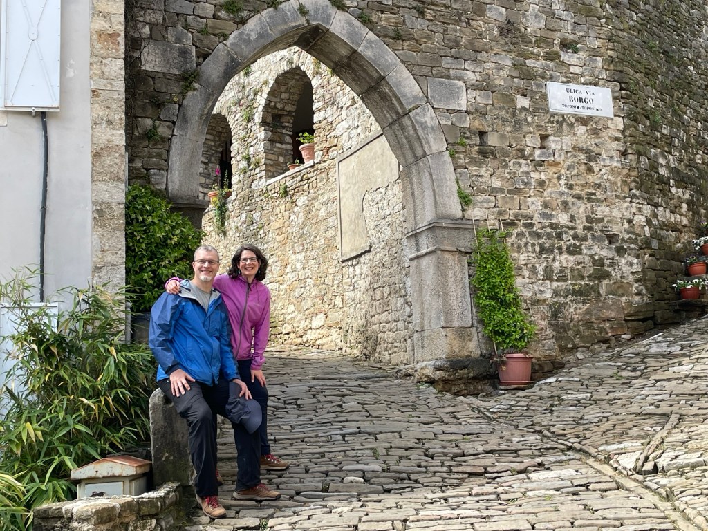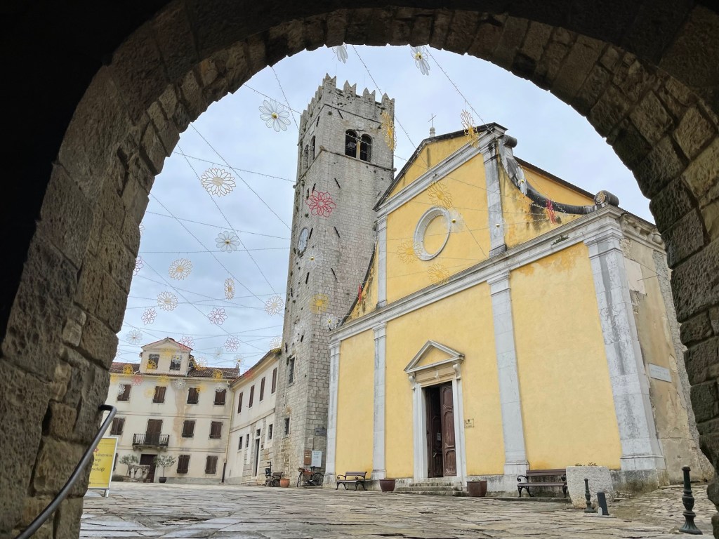 This morning when we woke up, Saint Euphemia was facing towards the land. Sure enough, the weather was gray and rainy — not a good day for walking around, but not so bad for driving in a car. Which was fortunate for us, because today we planned to visit several sites on the Istrian peninsula in the vicinity of Rovinj. Time for a road trip!