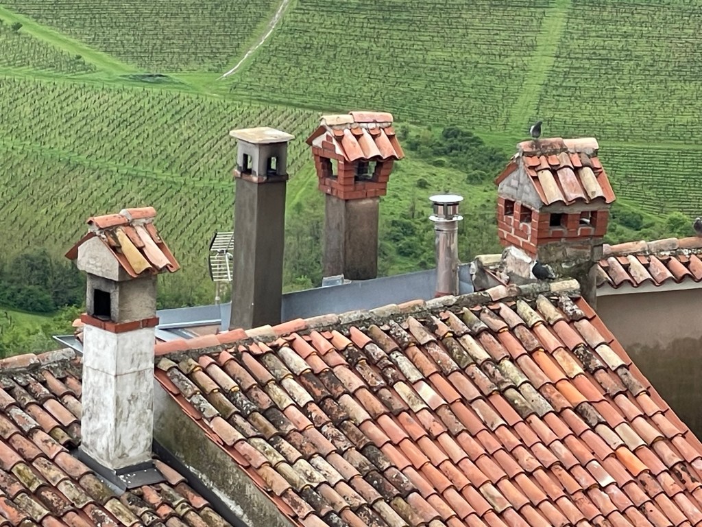 Outer gateInner gateMain square by the churchAlong the wallsA collection of fanciful chimneys, with vineyards in the fields belowPart of Motovun below the city wallsAn outer gateOn the way out of town, we had a great view of the full town of Motovun, no longer hidden by clouds