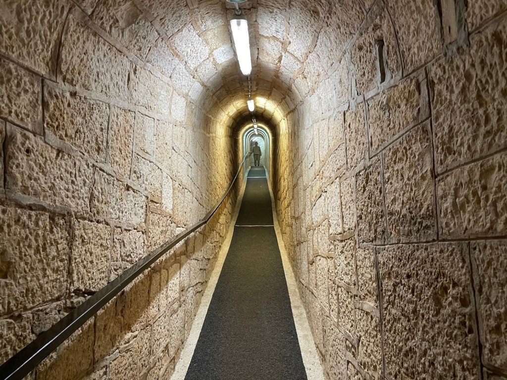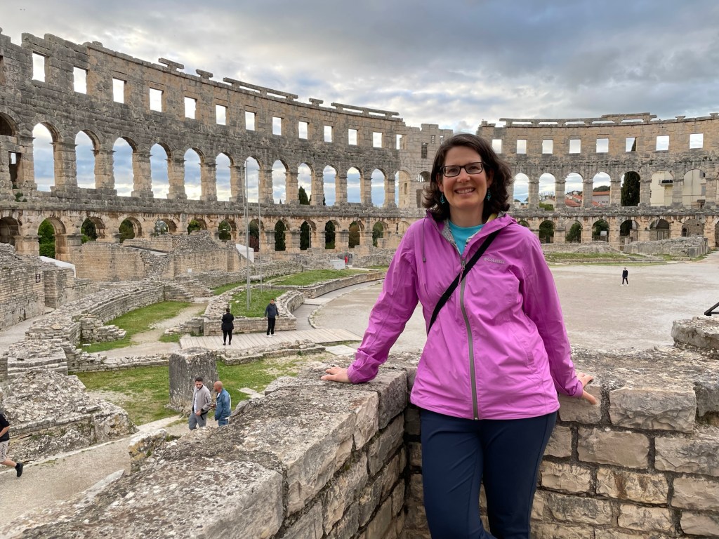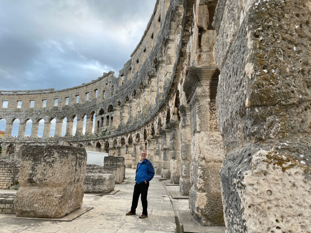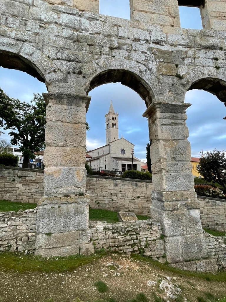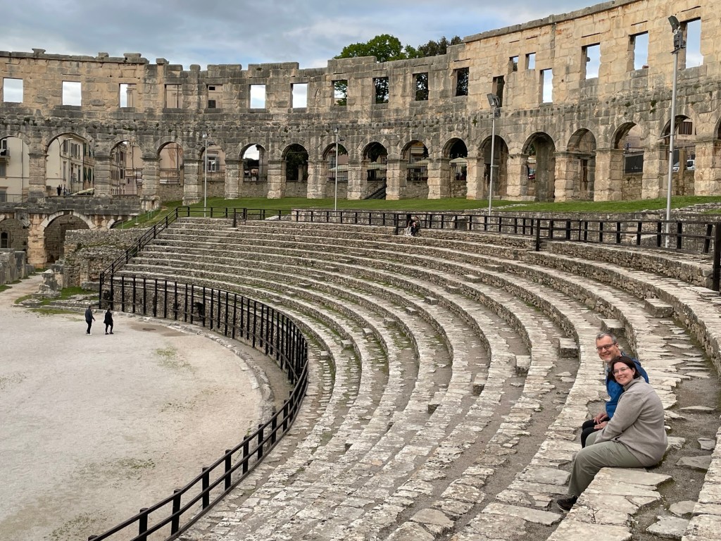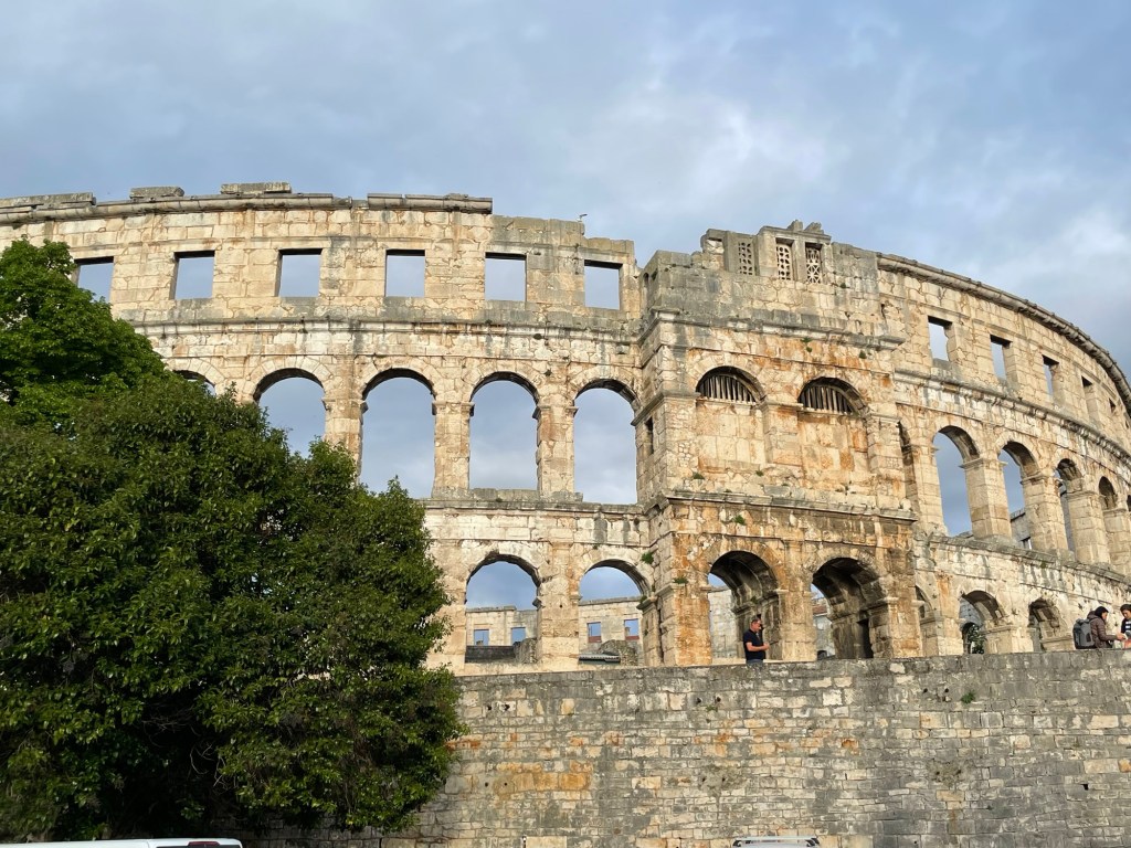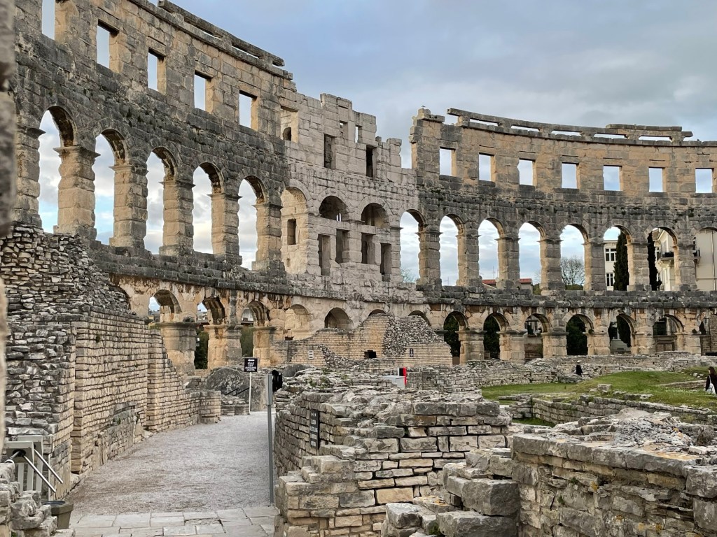Our other reason for driving to Pula, and our last sight of the day, was an enormous stone amphitheater built by the Romans. It’s not as large as the Colosseum in Rome, of course, but was among the ranks of the next largest in the empire and could hold 23,000 spectators when full. In many ways, stadium design hasn’t changed all that much in the last two millenia: like today’s arenas, the amphitheater consisted of a central performance area surrounded by seating (each spectator was allocated 44 centimeters of bench space) with ramps and concourses below to allow for access and concessions. Today most of the interior structure is gone, with the stone repurposed over many centuries for other building projects in the area. Luckily for us, the immense blocks of the outer wall were too big to easily remove and so their ring remains mostly intact. We spent a happy hour scrambling amongst the ruins and exploring the space, guided by numbered QR codes that linked to explanations of the history and architecture. When dusk fell, it was time to head back to our lodging in Rovinj, feasting along the way on sandwiches from a kebab shop picked up just outside the arena.