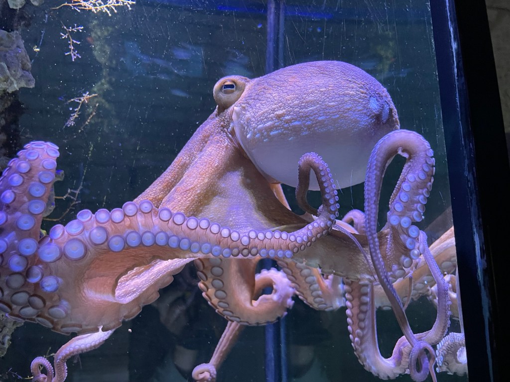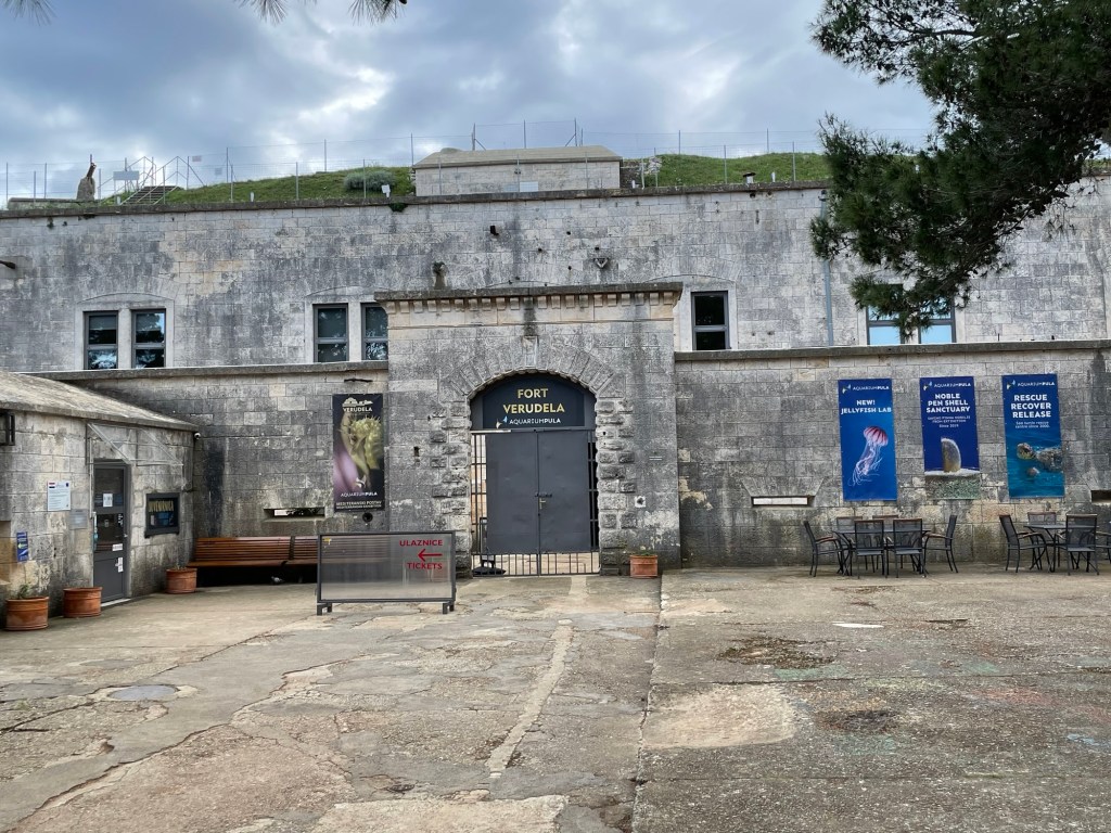 The former fort, now aquarium – quite the distinctive entrance!Steep hallway to a barbican, now in use as the aquarium’s movie theatreNewly hatched dogfish and protective casings (known as “mermaid purses”) around other developing embryosIs this a permanent installation? 🙂Inquisitive octopus #1Inquisitive octopus #2 (different tank)The roof of the (aquarium) fort offers views over Pula’s harbor