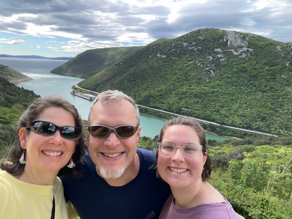 After departing our lodging in Mali Lošinj, we returned to Veli to drop off Rowan’s belongings and get a tour of their study abroad facilities. The program is housed in part of a health-focused hotel, situated on the edge of a healing forest. With a large classroom and lab space, dorm-style bedrooms, a common space with couches, and a kitchen and dining area, the students are well set up for learning and fun. Rowan showed us the wall where they will be painting a mural that depicts sea life at different depths, and we all enjoyed trying out the trampoline in the playground outside.