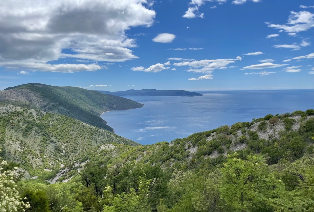 Rowan’s spring break is coming to an end, and tomorrow they will rejoin the rest of their cohort for the final month of the semester. In order to have some time to see the town where they have been living, we decided to travel there a day early and stay the night. Lošinj (low-SHEEN) is an island in the Adriatic, fairly large but not connected to the mainland, so the only way to get there with our car is by ferry. The ferry schedule runs every two hours. We had hoped to catch the 11:30 AM sailing after our scenic drive across the southern part of Istria, but when we arrived a little after 11 there was already a long line of cars waiting in line. The incoming ferry discharged 37 cars, and there were nearly 100 ahead of us, so we grimly imagined waiting around for four hours to get on the 3:30 boat.