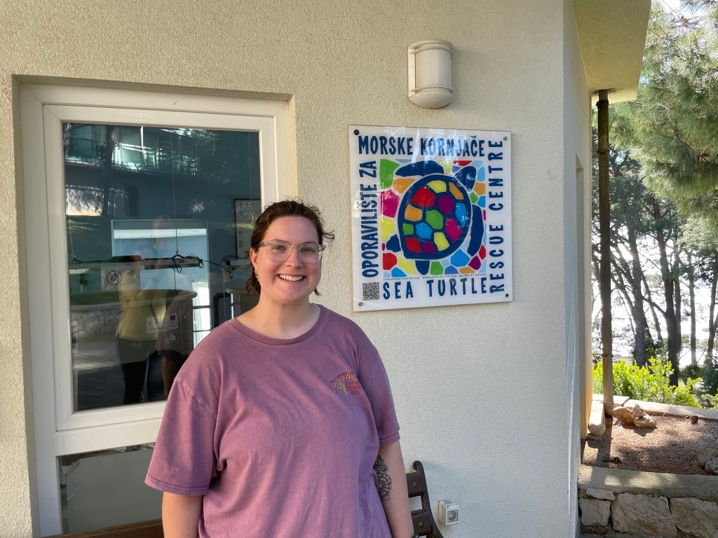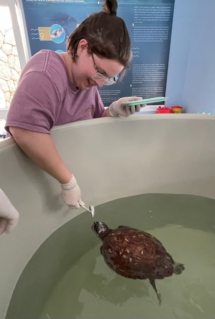 At the sea turtle rescue facilityFeeding PoloFeeding Cvita. She has no front flippers.Višnja rests on a mat outside her tank while it is cleanedRowan holding Višnja Višnja returns to her tank
