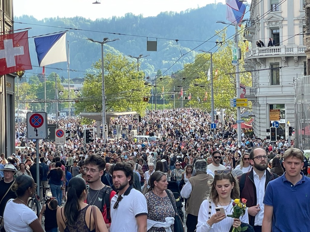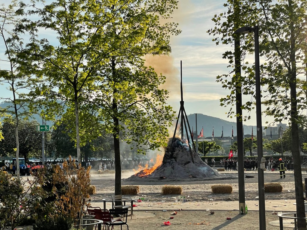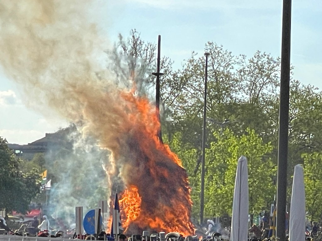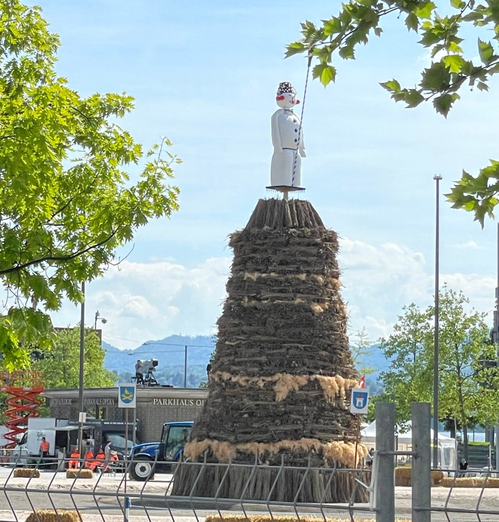 The crowd was impressively large, although we stayed away from the densest areas. The culmination of the day is the burning of the Böögg, an effigy installed atop a large pyre (with fencing to keep the crowd safely back). The Böögg is laced with fireworks, so that as it burns there are occasional explosions to keep you on your toes. Supposedly the speed at which he burns is predictive of the intensity of the coming summer.
