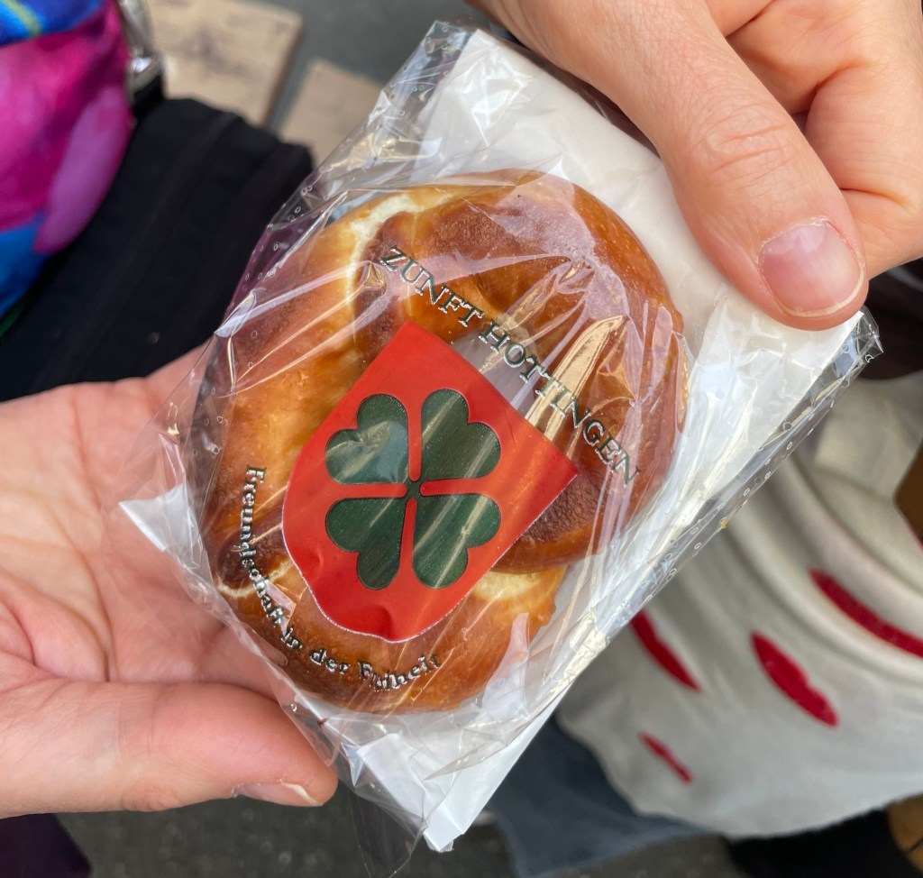 As all this parading is taking place, the spectators run out from time to time and present flowers to marchers they know or especially admire. As a result, by the end of it almost every single one is carrying a large bouquet, and some guilds even had extra carts where the flowers were piled to overflowing. (Susannah suspects that the entire festival was secretly organized by the flower merchants to promote their wares.) The other thing that is happening throughout is festive drinking. Many of the marchers carried glasses of beer, and our viewing location happened to be across from a beer tent where servers circulated carrying trays of beer for the participants. The spectators also received gifts: some of the guilds distributed rolls, or pretzels, or small cookies as they passed by.