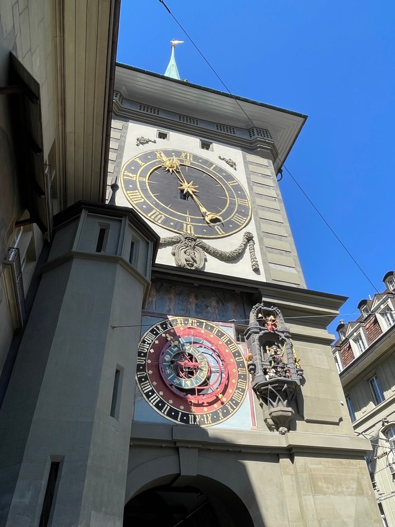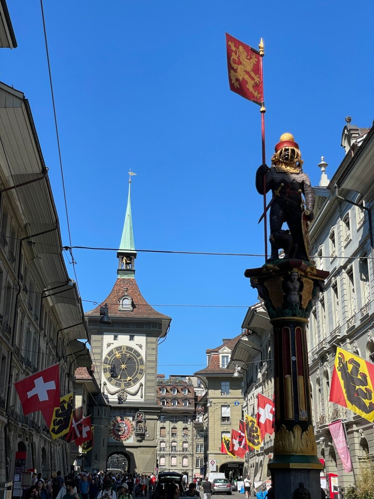 Lots of stores line the street behind the arcadesA fancy mechanical clock tower. We happened to be passing by at 11:00 and saw the show. First the animals at the bottom marched around in a parade, then the rooster flapped his wings and crowed. On the hour itself, a bell tolled as the king on the throne waved his scepter.Statue of an armored bear on a pedestal. The bear is the symbol of the city.In fact, the city keeps live bears in a public sanctuary by the riverside. We were lucky to see several out and about in their enclosure.The old city behind a bend in the fast-flowing river Aare. Nature path along the river