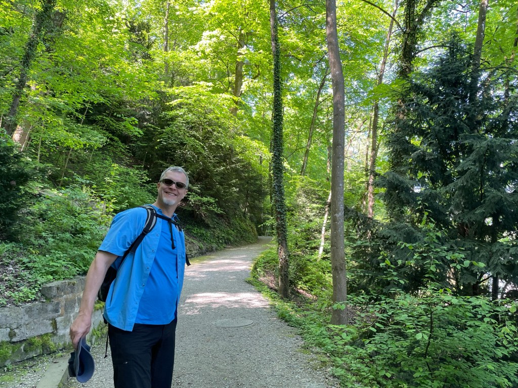 After the museum and an outdoor lunch right in the figurative shadow of the castle, we decided to take a walk up the hillside to see it as close as possible. A network of hiking paths (Wanderwege) crisscrosses the country, and our route took us along one.