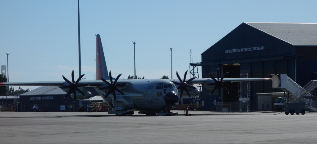Facilities of the U.S. Antarctic Program. Note the landing gear on the C-130 Hercules parked in front.