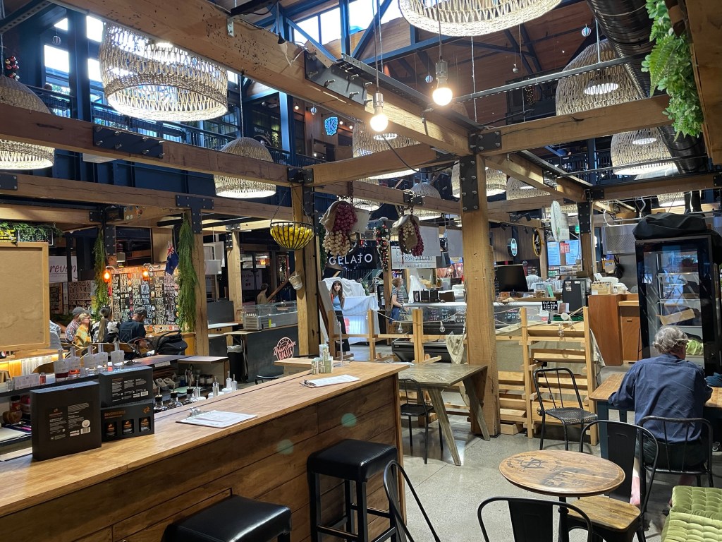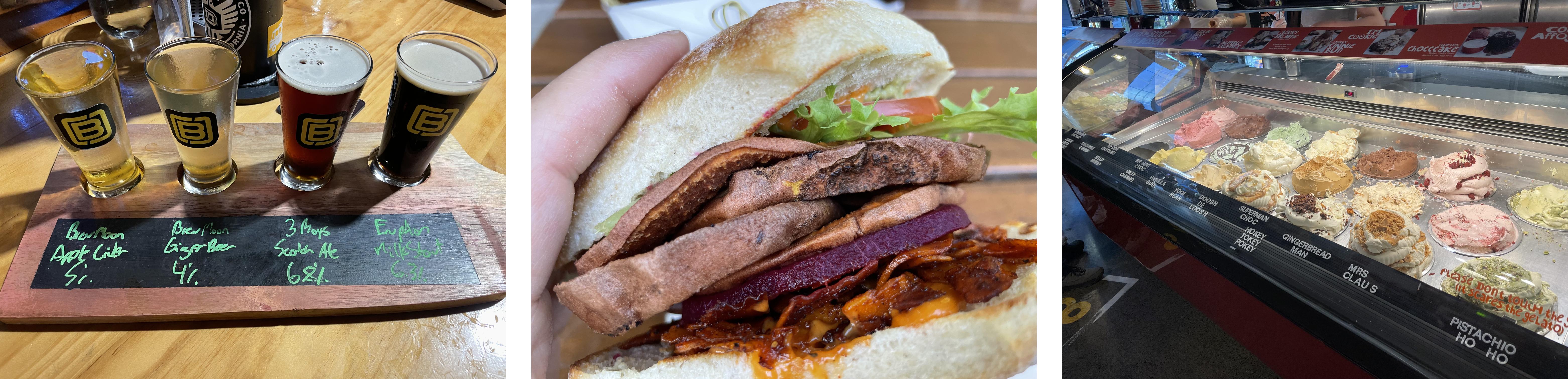 All good things eventually come to an end, as with this day and this fantastic trip. We arrived back in Christchurch in the evening, and were able to visit the Riverside Market for dinner because it stays open late on Thursdays. This emporium effectively serves as a food court for the entire city — within its walls, several dozen food stalls offer nearly every style of food you can imagine. During the day it buzzes with activity as people make their way through the narrow aisles, picking out their favorite foods. We sampled beer (plus cider and ginger), burgers (vegan and lamb), and gelato (dairy and coconut-based) – yum!