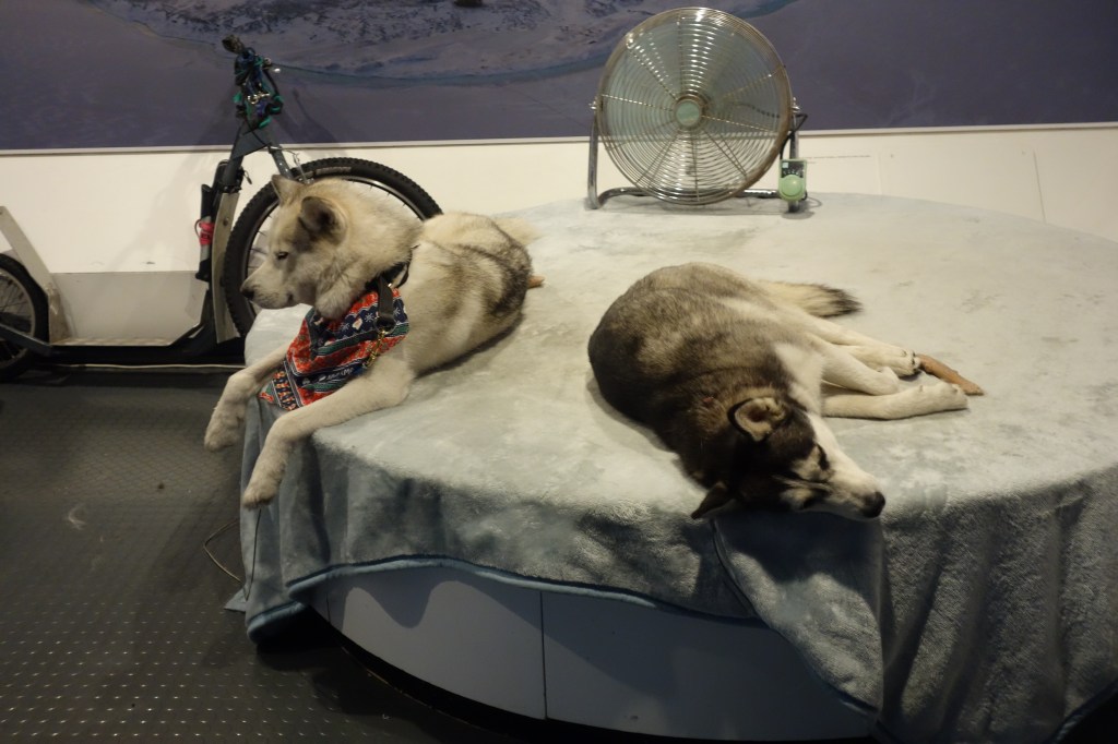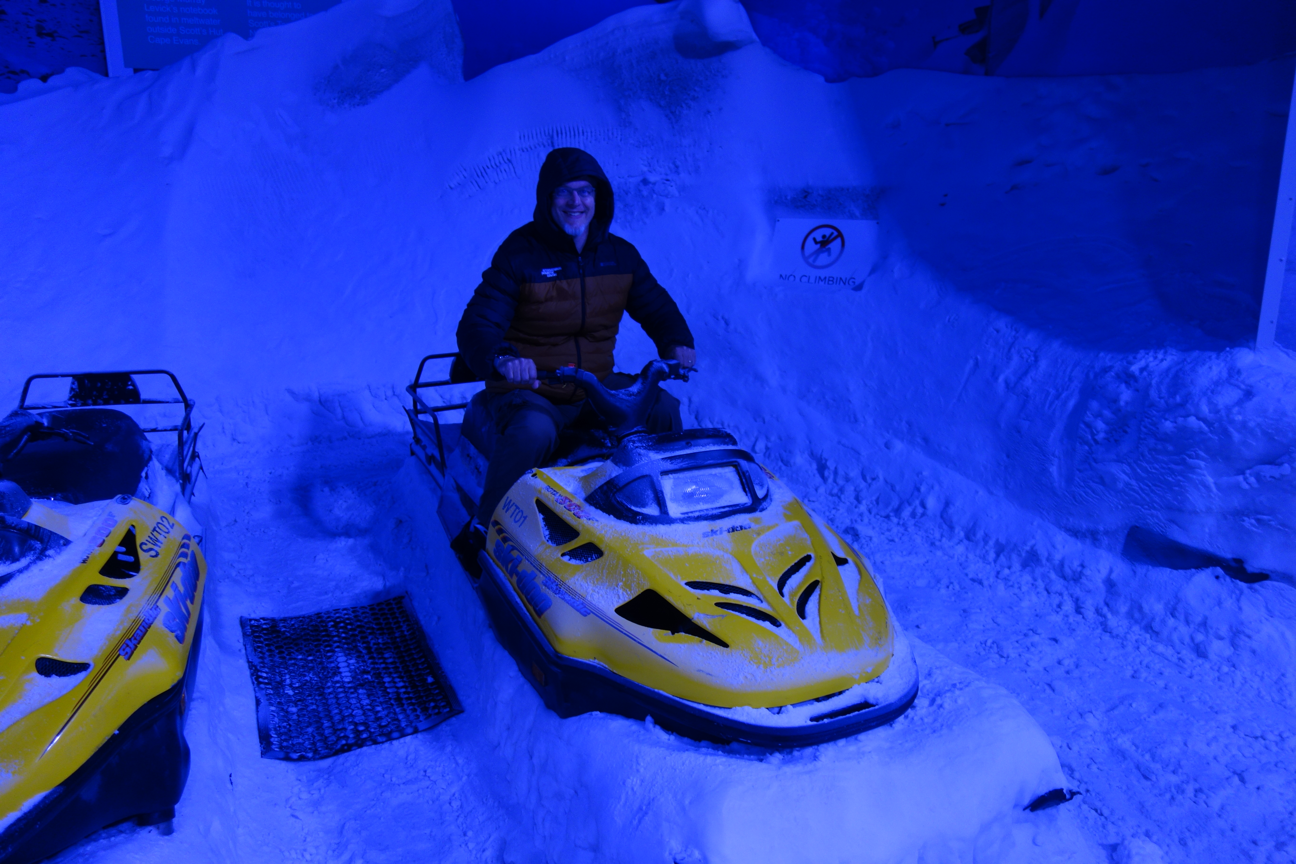 The simulation room. There is something odd about leaving a wintry place (MA) to come to a summery one (NZ), where one enters a room that simulates a wintry place.A little blue penguinSled dogs at restHägglund crossing– who is this sign for?