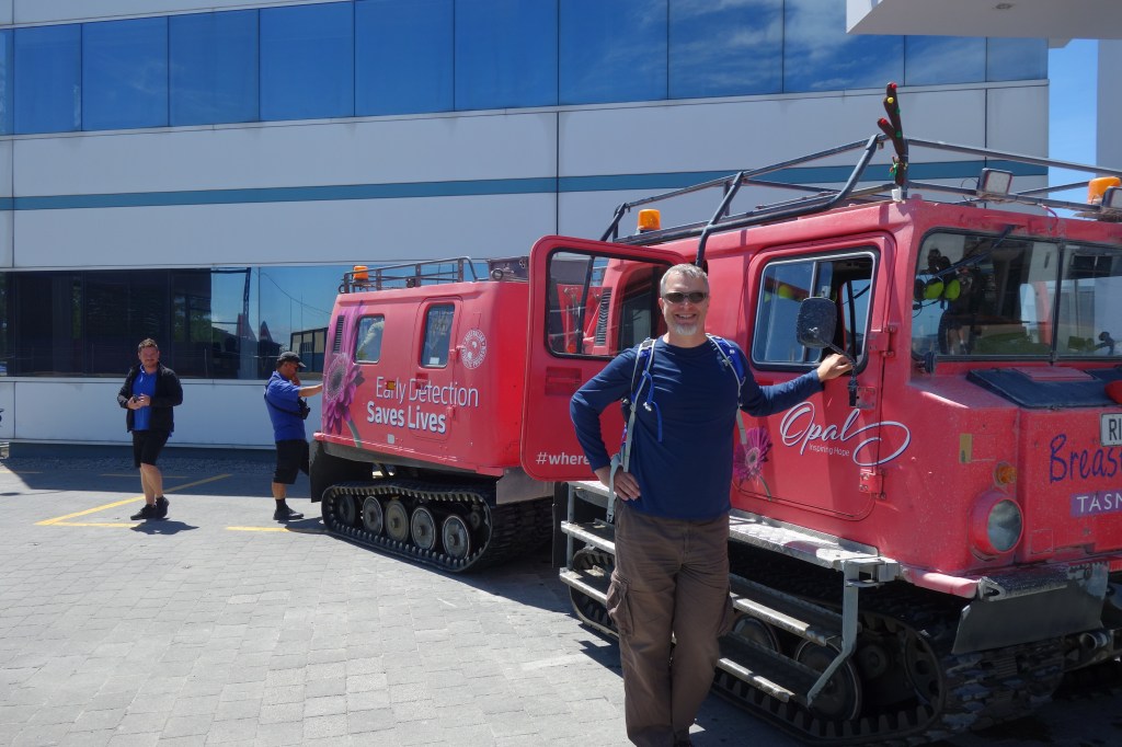 The Antarctic Experience has a number of unusual experiences on offer, including a simulation room chilled to the balmy summertime temperature of -8 degrees C, that featured real snow on the ground and periodic “storms” where the lights would dim and fans would generate a 25 mph breeze. Guests were required to wear insulated parkas and shoe covers before entering. They also run a penguin rehabilitation center, and had a room that featured several live sled dogs. (The latter are included as a historical note since they are no longer used on any of the bases today.) A number of informative exhibits taught about quotidian aspects of the program, such as the food crates (always red), holding enough sustenance to keep one individual alive for 20 days. Following the inside portion of the exhibit, guests like Nick had the chance to ride in a tracked articulated Hägglund cargo carrier as it navigated a prepared obstacle course featuring ravine/crevasse traversals, water crossings, and inclines of up to 45 degrees. These capable machines were originally built for the Swedish Army and have become the vehicle of choice for expeditions across rugged inland terrain.