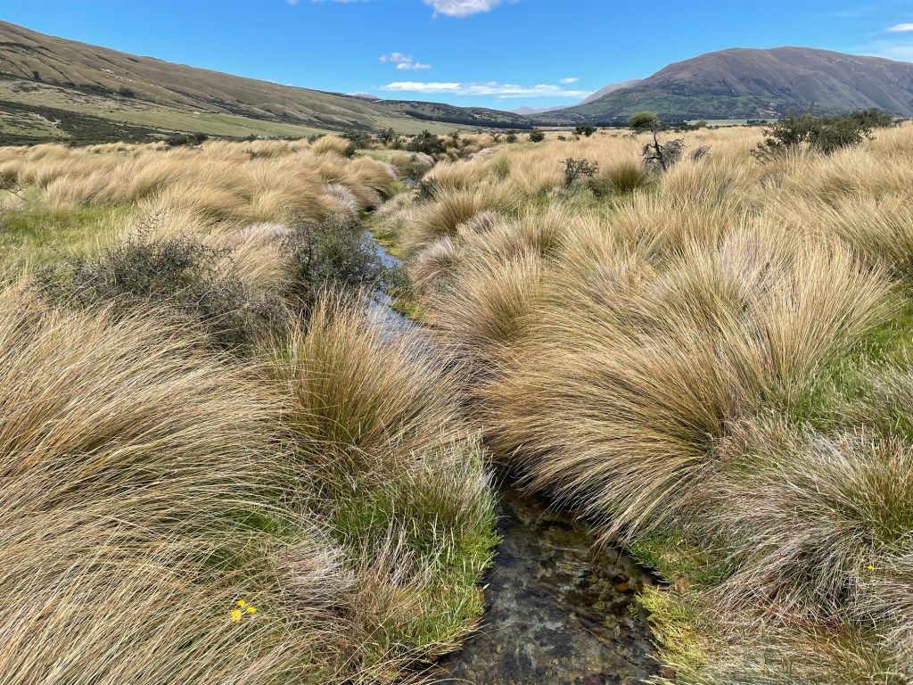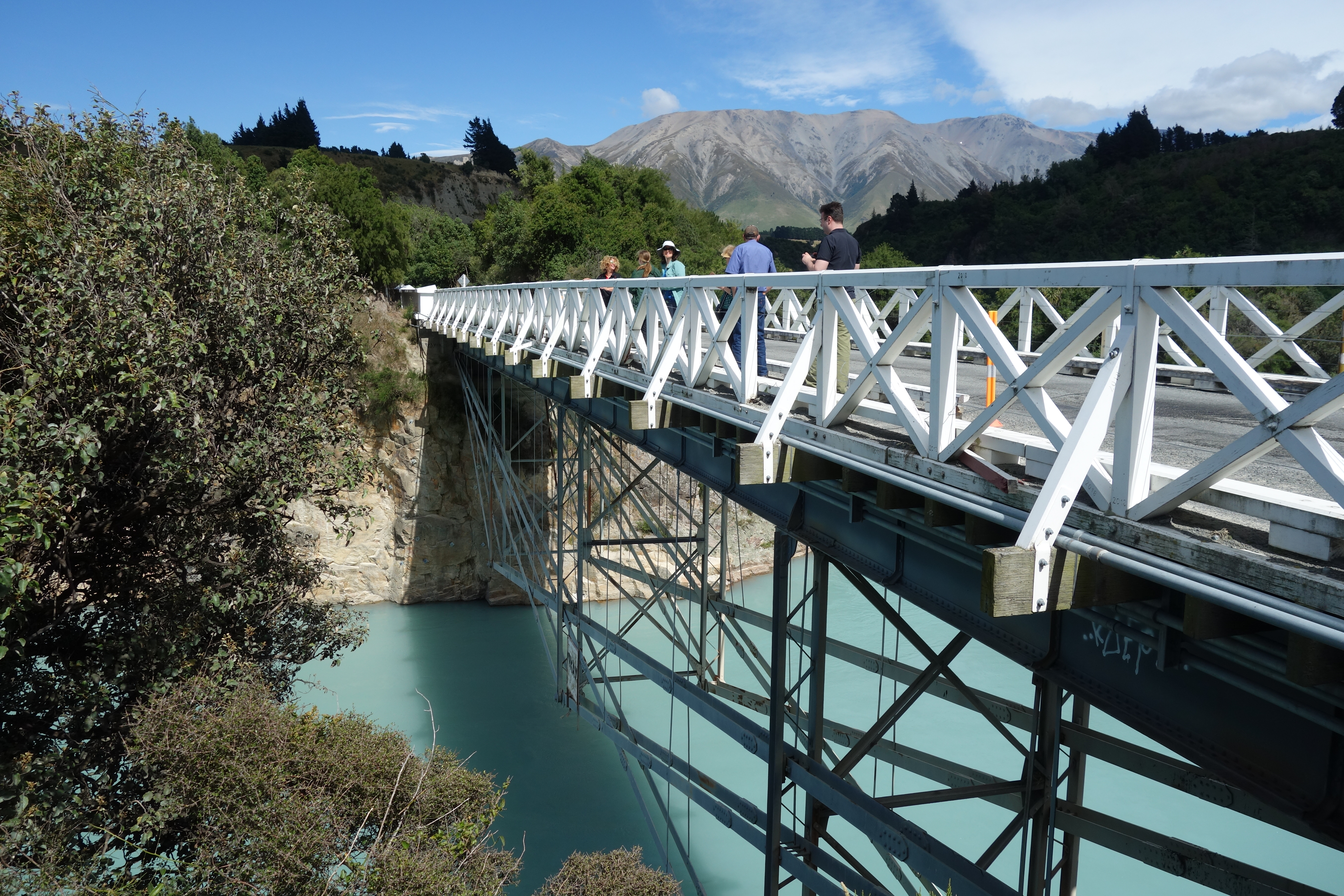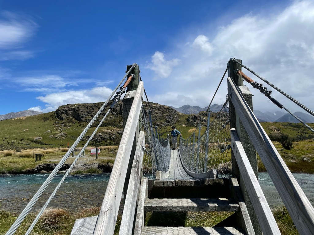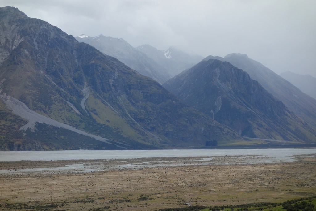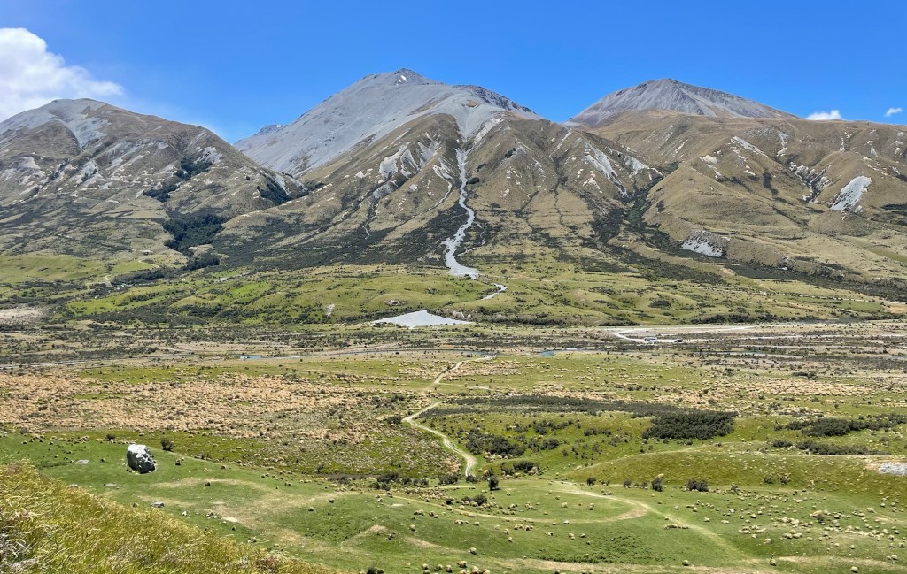 Nice license plate!Countryside on the way there crossed several rivers, including the Rakaia river shown here. It is an example of a “braided” river, which occur only under very specific conditions, including high but variable flow and significant constant erosion.Bridge over the Rakaia River. Built in 1882, it features an unusual design.We stopped at Lake Camp en route. The terrain is already starting to feel like Rohan.Our first view of Mount Sunday in the distance. Can you see it? Surrounded by larger peaks, it is the small rocky outcrop in the middle of the plain.