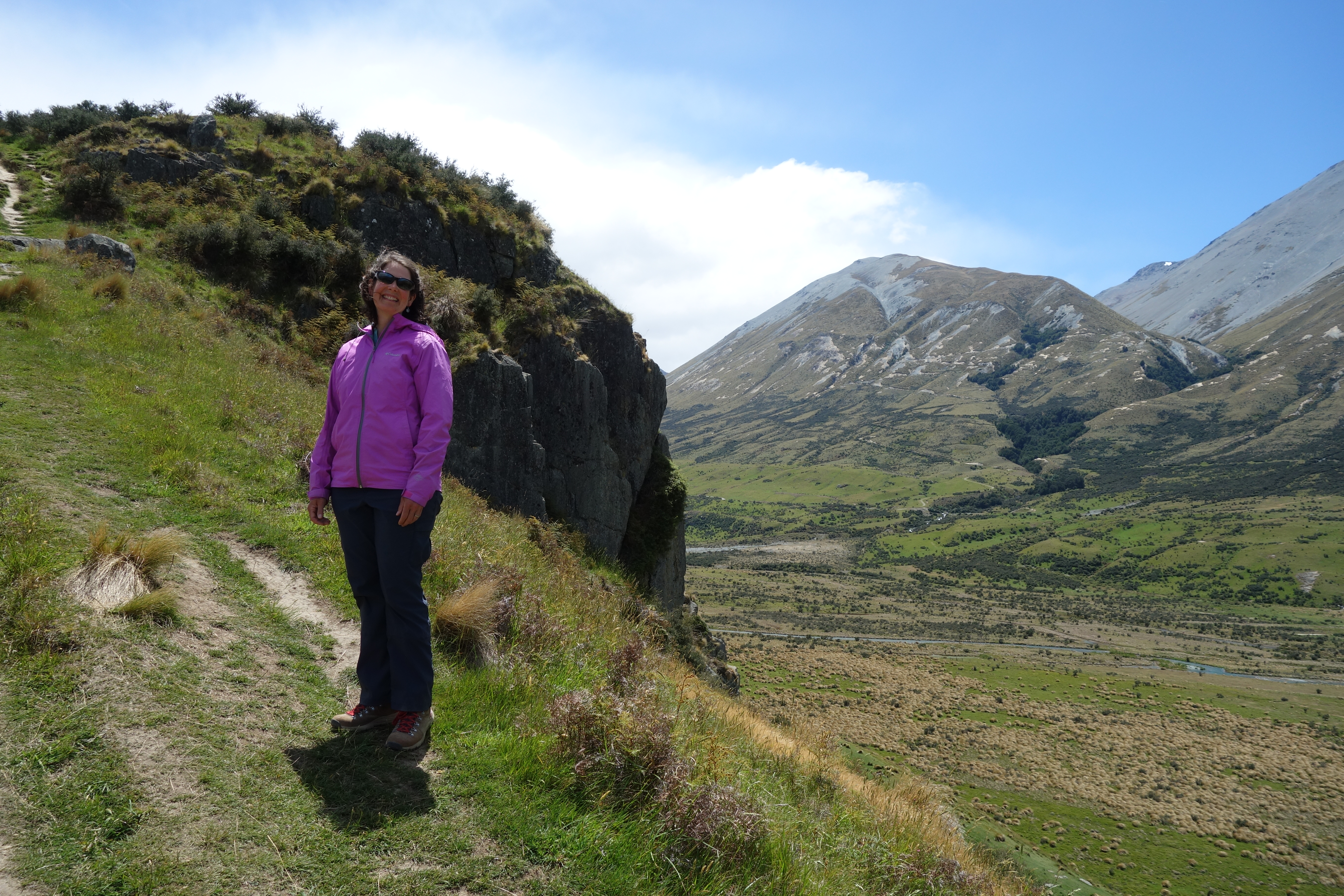 Susannah contemplates the valley below, as Eowyn once did. (View to the southwest)Our guide described scenes from the movie and where they were shot. (View to the southeast)View to the northeast, towards the car parksView to the south. Nick opted to carry the sword to the top for photographic purposes.View to the northwest, with people for scaleAt the summit. Here once stood Meduseld.View to the northwestSelfie in Rohan, contending with the windA narrow valley just west across the river was used for the external shots of Helm’s Deep.View from the trail to the top, looking northThe plain below was covered in tussocks.A final look back, as we depart