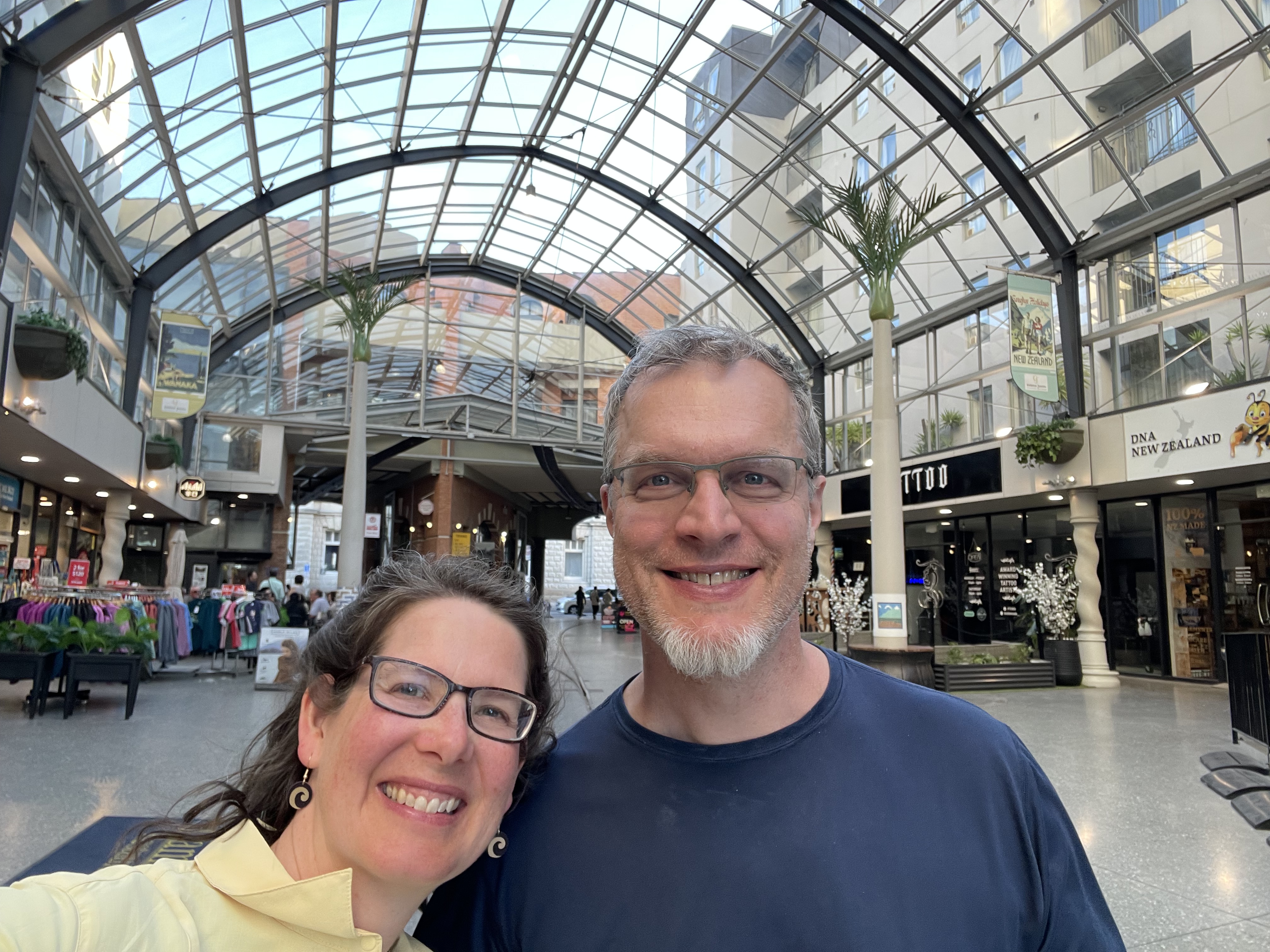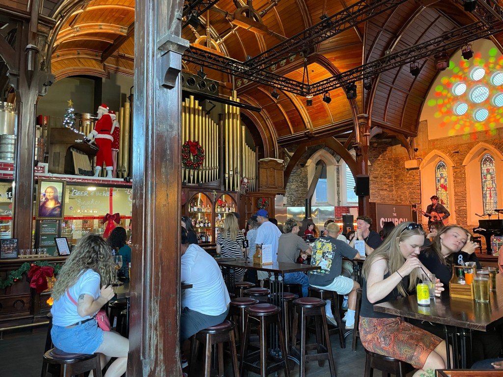 While Nick explored the Antarctic, Susannah attended the last day of her conference, and then spent the afternoon shadowing her former student Helena at Riley Consultants and meeting some of Helena’s work colleagues. By the evening, Nick and Susannah reconnected and took some time walking the city together. We returned to some of the sights that Nick had visited before so that Susannah could see them too, and we took turns on various playground equipment that seemed plenty large for adults. Dinner was at a historic church building that had been badly damaged in the earthquakes but ultimately rescued and turned into a brewpub, appropriately called the Church Brewpub. With live music daily, a pizza oven, and a good beer selection, it is very popular. After dinner we continued exploring, catching a glimpse of the Cardboard Cathedral, which was erected as a transitional building after the earthquake, and wandering the CDB shopping district. We’re well into December and many stores are decorated for Christmas – with the temperatures so warm, we still can’t wrap our heads around the upcoming holiday. One store in particular had several windows decorated with different holiday scenes, each of which was created by a local school, with the best entry set to receive a prize donation from the store.